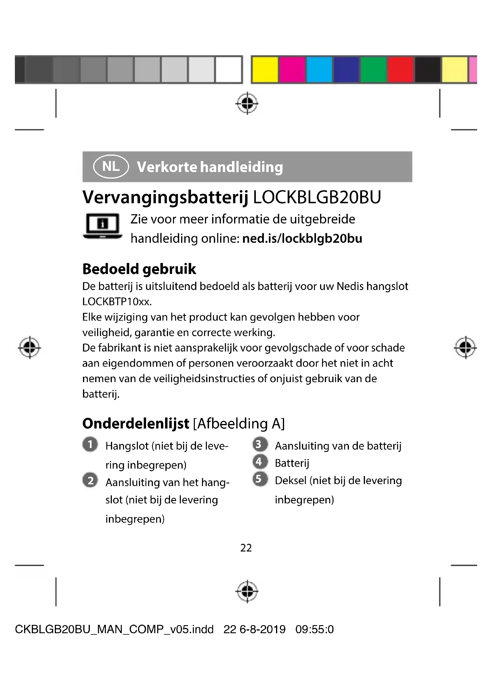 Verkorte handleiding Vervangingsbatterij LOCKBLGB20BU Zie voor meer informatie de uitgebreide handleiding online: ned.is/lockblgb20bu Bedoeld gebruik De batterij is uitsluitend bedoeld als batterij voor uw Nedis hangslot LOCKBTP10xx. Elke wijziging van het product kan gevolgen hebben voor veiligheid, garantie en correcte werking. De fabrikant is niet aansprakelijk voor gevolgschade of voor schade aan eigendommen of personen veroorzaakt door het niet in acht nemen van de veiligheidsinstructies of onjuist gebruik van de batterij. Onderdelenlijst [Afbeelding A]