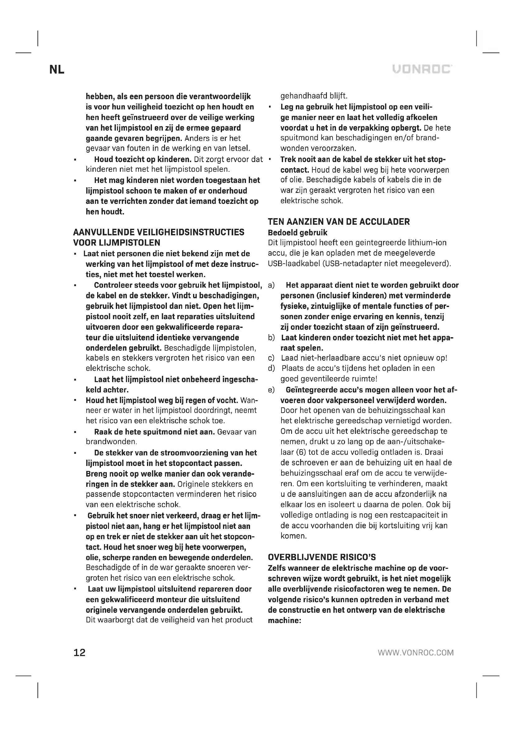 rek altijd de stekker uit het stopcontact voordat u onderhoudswerk gaat uitvoeren. Reinig de machinebehuizing regelmatig met een zachte doek, bij voorkeur iedere keer na gebruik. Zorg dat de ventilatiesleuven vrij van stof en vuil zijn. Gebruik bij hardnekkig vuil een zachte doek bevochtigd met zeepwater. Gebruik geen oplosmid- delen als benzine, alcohol, ammonia, etc. Dergelij- ke stoffen beschadigen de kunststof onderdelen. MILIEU Defecte en/of afgedankte elektrische of elektronische gereedschappen dienen ter verwerking te worden aangeboden aan een daarvoor verantwoordelijke instantie. Uitsluitend voor EG-landen Werp elektrisch gereedschap niet weg bij het huisvuil. Conform de Europese Richtlijn 2012/19/ EG voor Afgedankte Elektrische en Elektronische Apparatuur en de implementatie ervan in nationaal recht moet niet langer te gebruiken elektrisch gereedschap gescheiden worden verzameld en op een milieuvriendelijke wijze worden verwerkt. GARANTIE VONROC producten zijn ontworpen volgens de hoogste kwaliteitsstandaarden en gegarandeerd vrij van defecten, zowel materieel als fabrieksfou- ten, tijdens de wettelijk vastgestelde garantiepe- riode vanaf de eerste aankoopdatum. Mocht het product tijdens deze periode gebreken vertonen veroorzaakt door defecte materialen en/of fabrieks- fouten, neem dan rechtstreeks contact op met VONROC. De volgende situaties vallen niet onder de garantie: