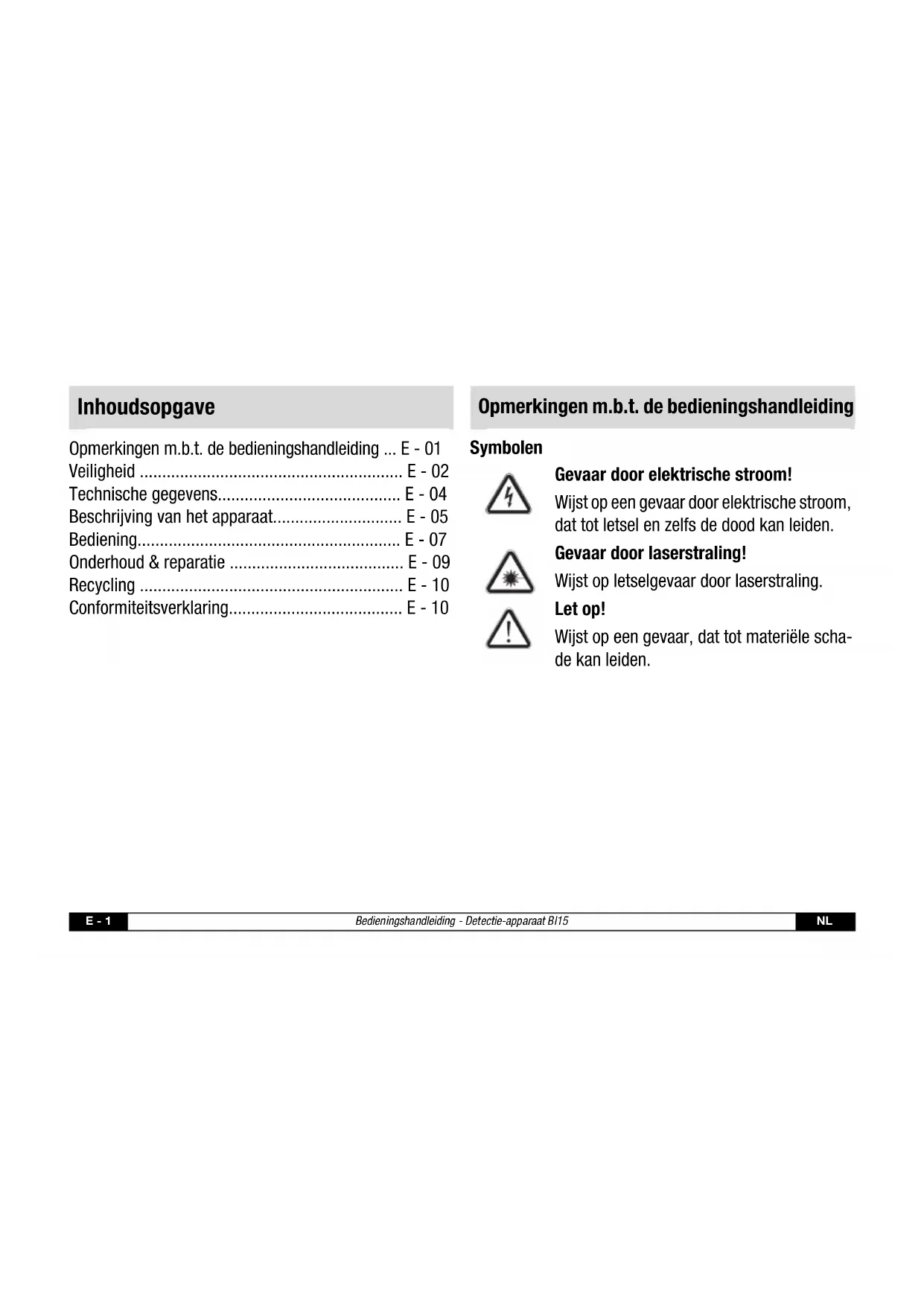 - de bedieningshandleiding, vooral het hoofdstuk "Vei- ligheid" hebben gelezen en begrepen.NL Bedieningshandleiding - Detectie-apparaat Bl15 E - 4 Technische gegevens Model BI15 Gewicht 180 g Afmetingen (h x b d) 180 x 67 x 38 mm Laservermogen < 1 mW (630–670 nm) Laserklasse ll Lasernauwkeurigheid 12,7 mm bij 6,1 m Maximale reikwijdte van de laser maximaal 6,1 m Rotatie van de laser 180° in 45° stappen Bedrijfstemperatuur -7 °C (19,4 °F) tot +49 °C (120,2 °F) Opslagtemperatuur -29 °C (20,2 °F) tot +66 °C (150,8 °F) Relatieve luchtvochtigheid 33-55 % Max. detectiediepte hout: maximaal 19 mm (3/4") Max. detectiediepte metaal + stroomgeleidende kabels: maximaal 38 mm (1 1/2") Voeding 9 V-blokbatterijE - 5 Bedieningshandleiding - Detectie-apparaat Bl15 NL Beschrijving van de werking Bij het detectie-apparaat BI15 kunnen kabels, houten balken of metalen schoren tot een diepte van 19 mm in wanden of vloeren worden gelocaliseerd. De exacte positie van balken en schoren kan via de uitlezing van de randen op het display worden bepaald. De 180° zwenk- bare laserpointer toont het verdere verloop van de balk. Voor een nauwkeurige uitlijning zijn twee waterpassen in het apparaat geïntegreerd. Met de instelbare rollen kan het apparaat ook op een oneffen ondergrond nauwkeurig waterpas worden gezet.
