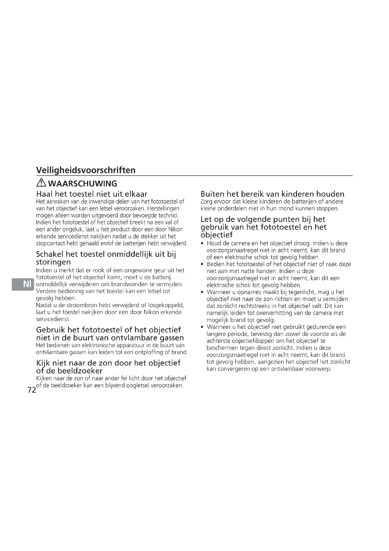 Veiligheidsvoorschriften WAARSCHUWING Haal het toestel niet uit elkaar Het aanraken van de inwendige delen van het fototoestel of van het objectief kan een letsel veroorzaken. Herstellingen mogen alleen worden uitgevoerd door bevoegde technici. Indien het fototoestel of het objectief breekt na een val of een ander ongeluk, laat u het product door een door Nikon erkende servicedienst nakijken nadat u de stekker uit het stopcontact hebt gehaald en/of de batterijen hebt verwijderd. Schakel het toestel onmiddellijk uit bij storingen Indien u merkt dat er rook of een ongewone geur uit het fototoestel of het objectief komt, moet u de batterij onmiddellijk verwijderen om brandwonden te vermijden. Verdere bediening van het toestel kan een letsel tot gevolg hebben. Nadat u de stroombron hebt verwijderd of losgekoppeld, laat u het toestel nakijken door een door Nikon erkende servicedienst. Gebruik het fototoestel of het objectief niet in de buurt van ontvlambare gassen Het bedienen van elektronische apparatuur in de buurt van ontvlambare gassen kan leiden tot een ontploffing of brand. Kijk niet naar de zon door het objectief of de beeldzoeker Kijken naar de zon of naar ander fel licht door het objectief of de beeldzoeker kan een blijvend oogletsel veroorzaken. Buiten het bereik van kinderen houden Zorg ervoor dat kleine kinderen de batterijen of andere kleine onderdelen niet in hun mond kunnen stoppen. Let op de volgende punten bij het gebruik van het fototoestel en het objectief