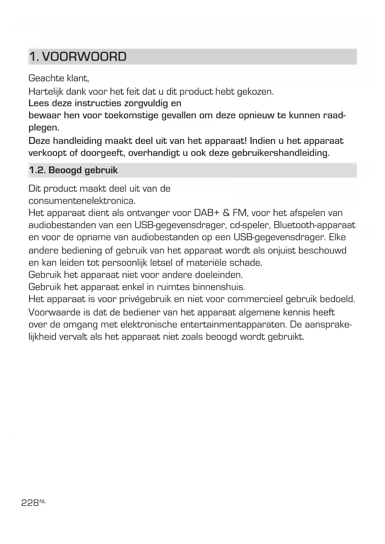 Geachte klant, Hartelijk dank voor het feit dat u dit product hebt gekozen. Lees deze instructies zorgvuldig en bewaar hen voor toekomstige gevallen om deze opnieuw te kunnen raad- plegen. Deze handleiding maakt deel uit van het apparaat! Indien u het apparaat verkoopt of doorgeeft, overhandigt u ook deze gebruikershandleiding. 1.2. Beoogd gebruik Dit product maakt deel uit van de consumentenelektronica. Het apparaat dient als ontvanger voor DAB+ & FM, voor het afspelen van audiobestanden van een USB-gegevensdrager, cd-speler, Bluetooth-apparaat en voor de opname van audiobestanden op een USB-gegevensdrager. Elke andere bediening of gebruik van het apparaat wordt als onjuist beschouwd en kan leiden tot persoonlijk letsel of materiële schade. Gebruik het apparaat niet voor andere doeleinden. Gebruik het apparaat enkel in ruimtes binnenshuis. Het apparaat is voor privégebruik en niet voor commercieel gebruik bedoeld. Voorwaarde is dat de bediener van het apparaat algemene kennis heeft over de omgang met elektronische entertainmentapparaten. De aansprake- lijkheid vervalt als het apparaat niet zoals beoogd wordt gebruikt.NL