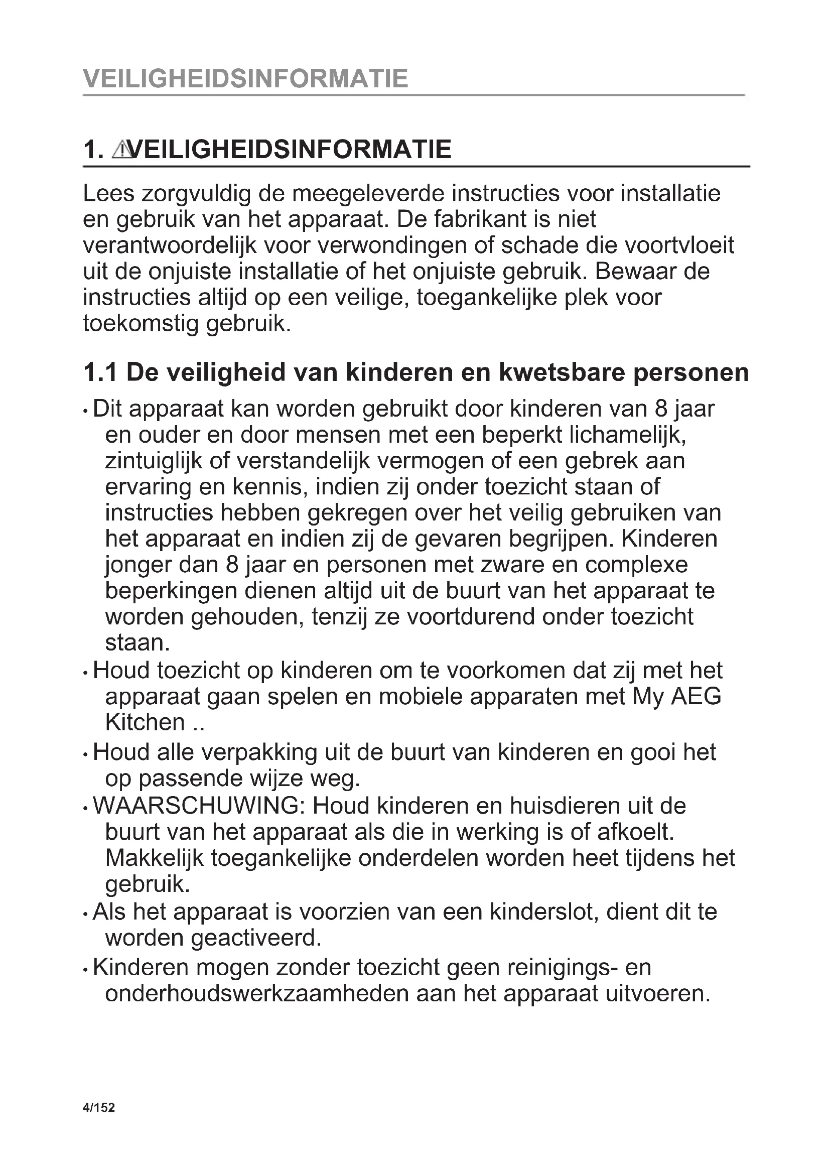 - Kinderen mogen zonder toezicht geen reinigings- en onderhoudswerkzaamheden aan het apparaat uitvoeren. 4/152 VEILIGHEIDSINFORMATIE1.2 Algemene veiligheid