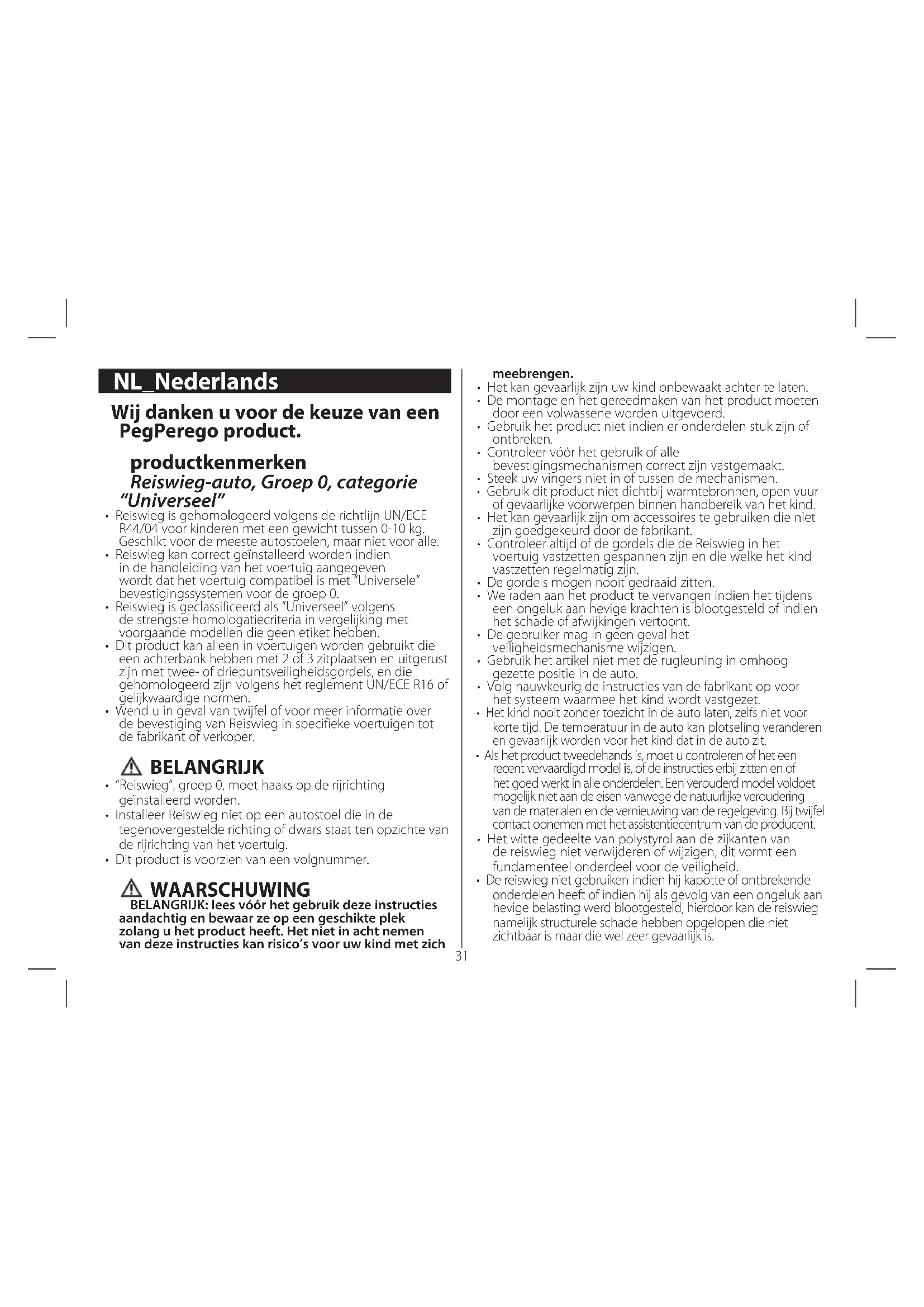 E-mail: info@burigotto.com.br - www.burigotto.com.br31 Wij danken u voor de keuze van een PegPerego product. productkenmerken Reiswieg-auto, Groep 0, categorie “Universeel”