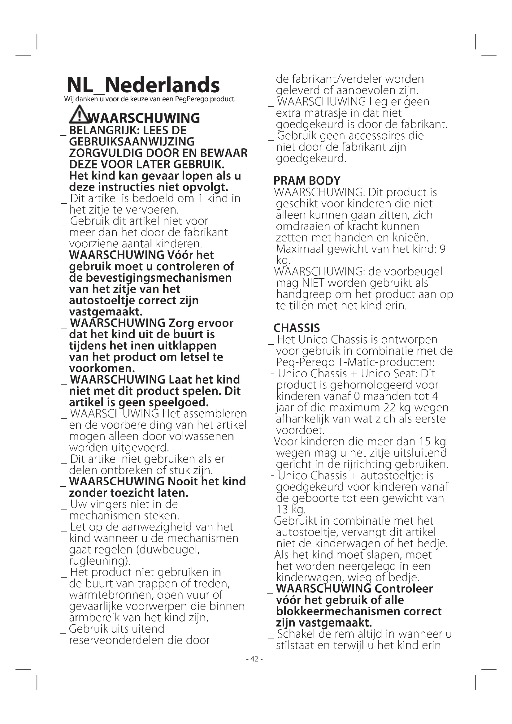 Se, por acaso, partes do modelo forem perdidas ou danificadas, use apenas peças sobresselentes originais da PegPerego. Para eventuais reparações, substituições, informações sobre os produtos, venda de peças originais e acessórios, contacte o Serviço de Assistência PegPerego indicando o número de série do produto. tel. 0039/039/60.88.213 linha verde: 800/147.414 e-mail assistenza@pegperego.com sítio internet www.pegperego.com Todos os direitos de propriedade intelectual relativos aos conteúdos deste manual de instruções pertencem à PegPerego S.p.A. e estão protegidos pelas leis vigentes.- 42 - de fabrikant/verdeler worden geleverd of aanbevolen zijn. _ WAARSCHUWING Leg er geen extra matrasje in dat niet goedgekeurd is door de fabrikant. _ Gebruik geen accessoires die niet door de fabrikant zijn goedgekeurd. PRAM BODY WAARSCHUWING: Dit product is geschikt voor kinderen die niet alleen kunnen gaan zitten, zich omdraaien of kracht kunnen zetten met handen en knieën. Maximaal gewicht van het kind: 9 kg. WAARSCHUWING: de voorbeugel mag NIET worden gebruikt als handgreep om het product aan op te tillen met het kind erin. CHASSIS _ Het Unico Chassis is ontworpen voor gebruik in combinatie met de Peg-Perego T-Matic-producten: - Unico Chassis + Unico Seat: Dit product is gehomologeerd voor kinderen vanaf 0 maanden tot 4 jaar of die maximum 22 kg wegen afhankelijk van wat zich als eerste voordoet. Voor kinderen die meer dan 15 kg wegen mag u het zitje uitsluitend gericht in de rijrichting gebruiken. - Unico Chassis + autostoeltje: is goedgekeurd voor kinderen vanaf de geboorte tot een gewicht van 13 kg. Gebruikt in combinatie met het autostoeltje, vervangt dit artikel niet de kinderwagen of het bedje. Als het kind moet slapen, moet het worden neergelegd in een kinderwagen, wieg of bedje. _ WAARSCHUWING Controleer vóór het gebruik of alle blokkeermechanismen correct zijn vastgemaakt. _ Schakel de rem altijd in wanneer u stilstaat en terwijl u het kind erin NL_Nederlands Wij danken u voor de keuze van een PegPerego product. WAARSCHUWING