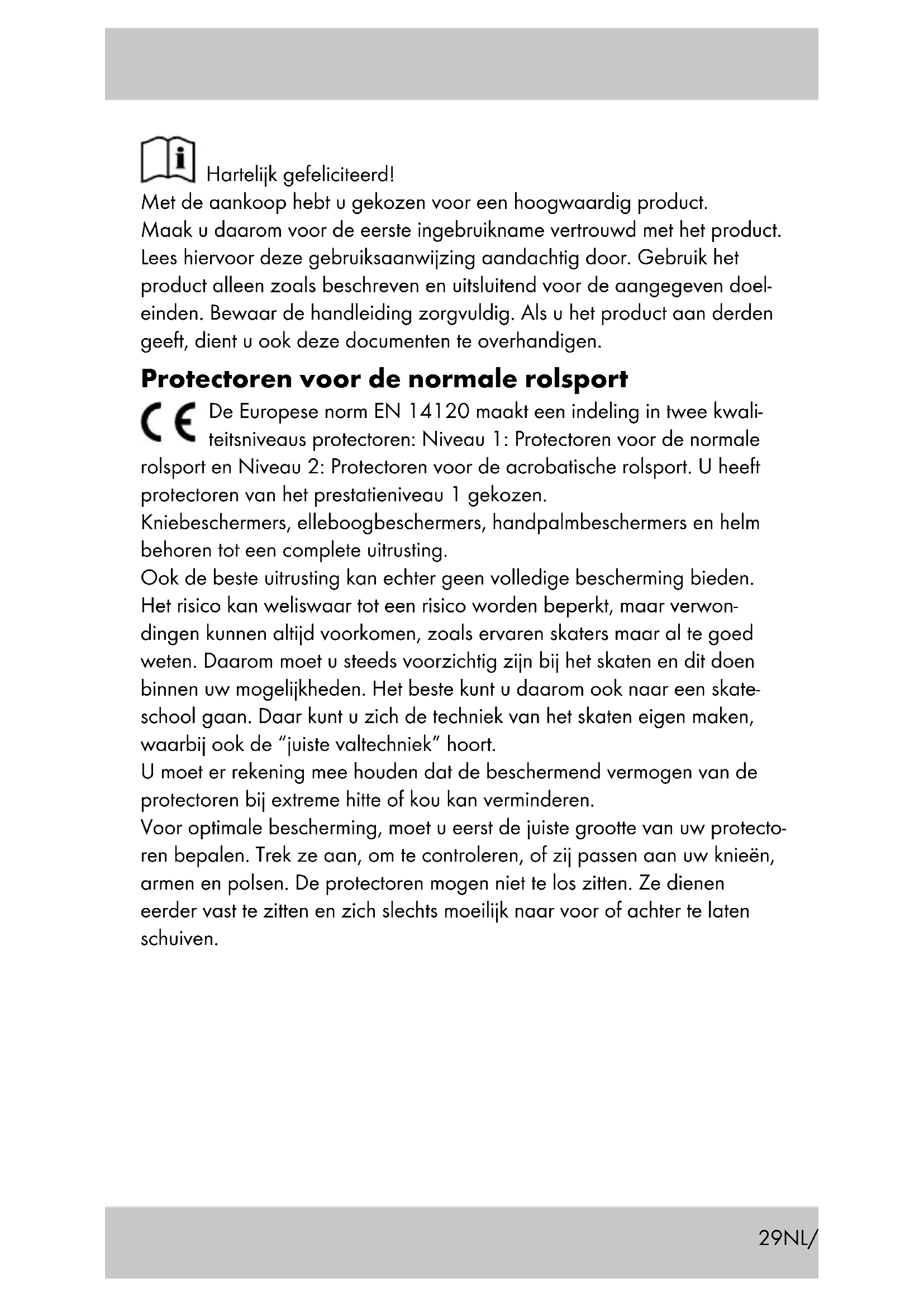 Wragekamp 6, D-22397 Hamburg Année de fabrication : 2015 Contrôle de modèle de construction CE selon EN 14120:2003 + A1:2007 Level 1 (Protections pour le sport à roulettes normal) Range A (Protections pour utilisateurs d’un poids de moins de 25 kg) Taille 3 - 7 ans (100 -130 cm) Range B (Protections pour utilisateurs d’un poids de 25 à 50 kg) Taille 8 -12 ans (130 -160 cm) Contrôlé par le TÜV Rheinland LGA Products GmbH Tillystr. 2, D-90431 Nürnberg, Allemagne Notified body no. 019729NL/BE Hartelijk gefeliciteerd! Met de aankoop hebt u gekozen voor een hoogwaardig product. Maakudaarom voor de eerste ingebruikname vertrouwd met het product. Leeshiervoor deze gebruiksaanwijzing aandachtig door. Gebruik het product alleen zoals beschreven en uitsluitend voor de aangegeven doel- einden. Bewaar de handleiding zorgvuldig. Als u het product aan derden geeft, dient u ook deze documenten te overhandigen. Protectoren voor de normale rolsport De Europese norm EN 14120 maakt een indeling in twee kwali- teitsniveaus protectoren: Niveau 1: Protectoren voor de normale rolsport en Niveau 2: Protectoren voor de acrobatische rolsport. U heeft protectoren van het prestatieniveau1 gekozen. Kniebeschermers, elleboogbeschermers, handpalmbeschermers en helm behoren tot een complete uitrusting. Ook de beste uitrusting kan echter geen volledige bescherming bieden. Het risico kan weliswaar tot een risico worden beperkt, maar verwon- dingen kunnen altijd voorkomen, zoals ervaren skaters maar al te goed weten. Daarom moet u steeds voorzichtig zijn bij het skaten en dit doen binnen uw mogelijkheden. Het beste kunt u daarom ook naar een skate- school gaan. Daar kunt u zich de techniek van het skaten eigen maken, waarbij ook de “juiste valtechniek” hoort. U moet er rekening mee houden dat de beschermend vermogen van de protectoren bij extreme hitte of kou kan verminderen. Voor optimale bescherming, moet u eerst de juiste grootte van uw protecto- ren bepalen. Trek ze aan, om te controleren, of zij passen aan uw knieën, armen en polsen. De protectoren mogen niet te los zitten. Ze dienen eerder vast te zitten en zich slechts moeilijk naar voor of achter te laten schuiven.30 NL/BE Hoe trekt u de knie- en elleboogbeschermers aan