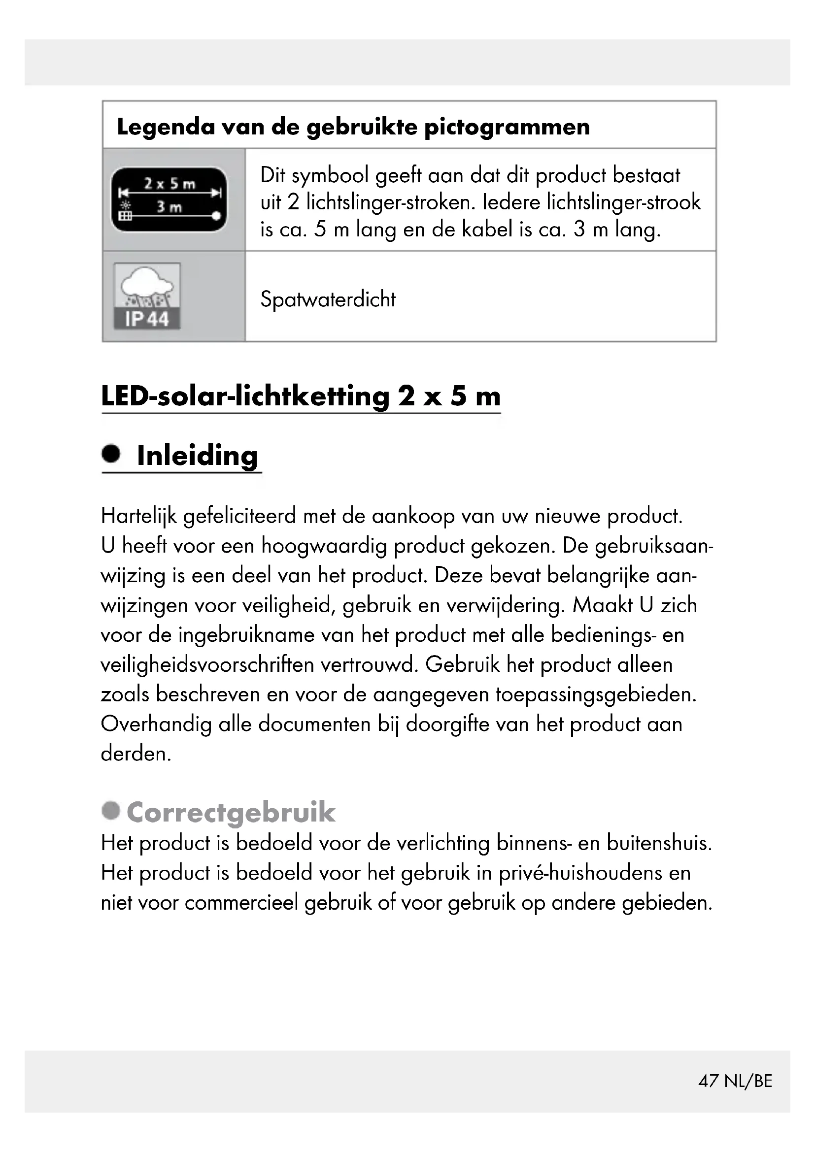 (wissel- stroom) aansluiting.50 NL/BE Dit product is geen speelgoed, het hoort niet thuis in kinder- handen. Kinderen zijn zich niet bewust van de gevaren die ontstaan tijdens de omgang met het product. WAARSCHUWING! Deze lichtslinger mag niet worden ge- bruikt zonder dat alle dichtingen correct zijn aangebracht. Productspecifieke veiligheidsinstructies Let erop dat het zonnepaneel