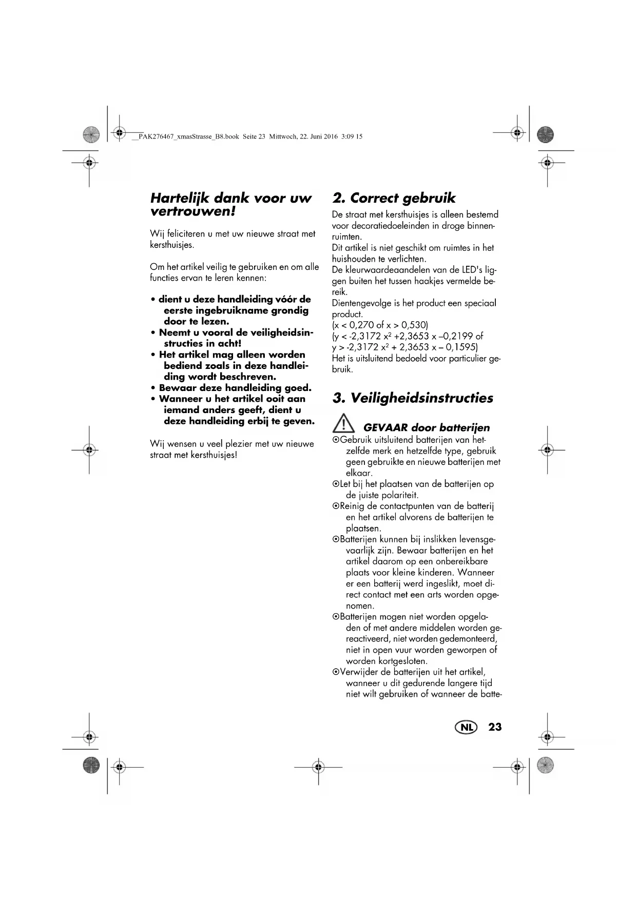 GEVAAR door batterijen ~ Gebruik uitsluitend batterijen van het- zelfde merk en hetzelfde type, gebruik geen gebruikte en nieuwe batterijen met elkaar. ~ Let bij het plaatsen van de batterijen op de juiste polariteit. ~ Reinig de contactpunten van de batterij en het artikel alvorens de batterijen te plaatsen. ~ Batterijen kunnen bij inslikken levensge- vaarlijk zijn. Bewaar batterijen en het artikel daarom op een onbereikbare plaats voor kleine kinderen. Wanneer er een batterij werd ingeslikt, moet di- rect contact met een arts worden opge- nomen. ~ Batterijen mogen niet worden opgela- den of met andere middelen worden ge- reactiveerd, niet worden gedemonteerd, niet in open vuur worden geworpen of worden kortgesloten. ~ Verwijder de batterijen uit het artikel, wanneer u dit gedurende langere tijd niet wilt gebruiken of wanneer de batte- __PAK276467_xmasStrasse_B8.book Seite 23 Mittwoch, 22. Juni 2016 3:09 1524