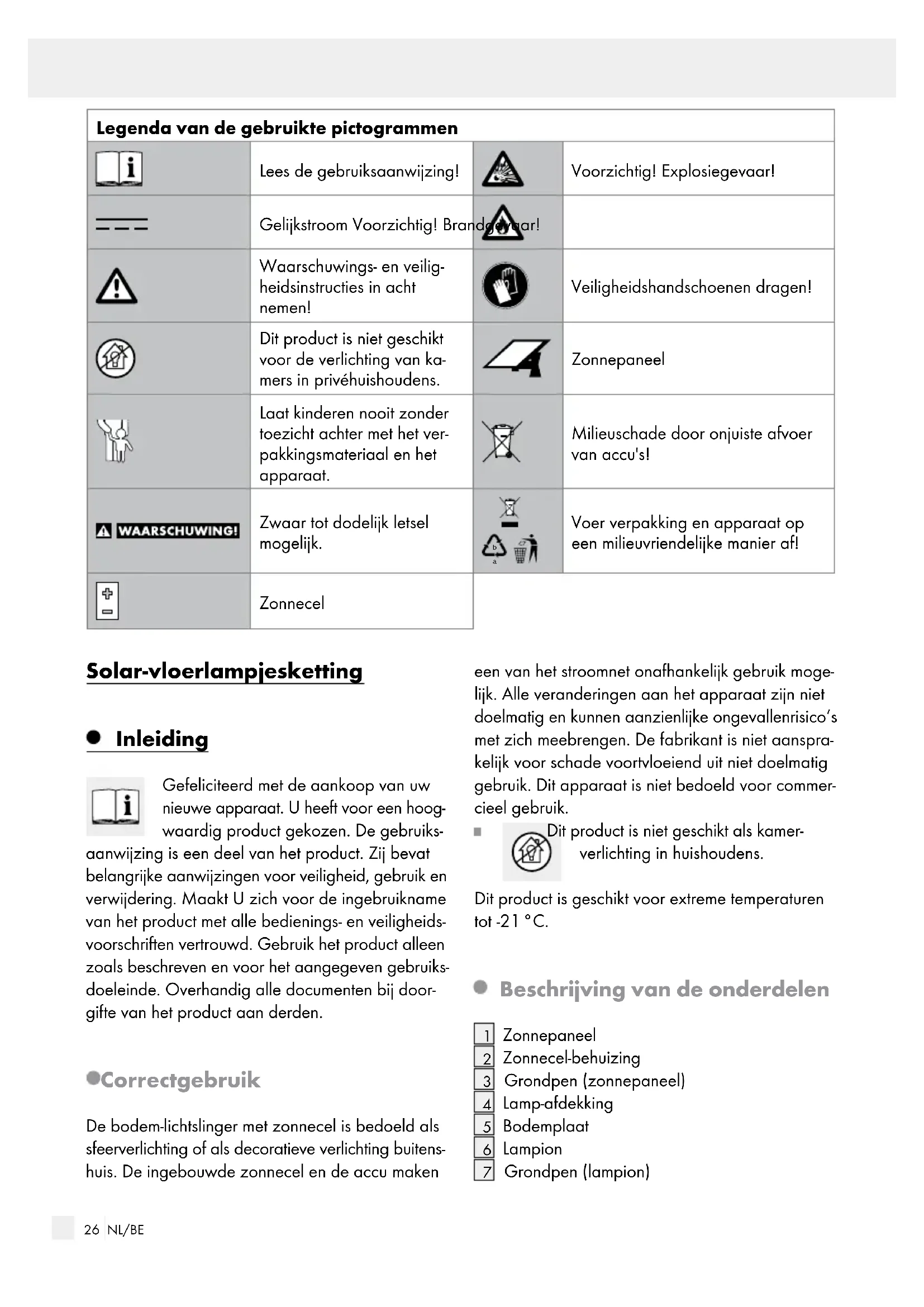 in te schakelen. Accu opladen De laadduur van de accu‘s bij gebruik van de zon- necel is afhankelijk van de lichtintensiteit van de zonnestralen en de invalshoek van het licht op de zonnecel. Zet de zonnecel zo haaks mogelijk op de lichtinval. Zo krijgt de zonnecel het meeste licht. Onderhoud en reiniging De lichtdioden kunnen niet worden vervangen. De bodem-lichtslinger met zonnecel is, afgezien van het vervangen van de batterij, onderhoudsvrij. Reinig de bodem-lichtslinger met zonnecel regelmatig met een droge, pluisvrije doek. Gebruik bij sterke verontreinigingen een iets vochtige doek. Storingen verhelpen Opmerking: Het apparaat bevat gevoelige elek- tronische componenten. Daarom is het mogelijk dat het door radiografische apparaten in de directe omgeving verstoord wordt. Bij eventuele functionele storingen moeten mogelijke storingsbronnen uit de omgeving van het product worden verwijderd. Opmerking: elektrostatische ontladingen kunnen tot functiestoringen leiden. Verwijder bij dergelijke functionele storingen even de batterij en plaats deze dan opnieuw. Storing Oorzaak Oplossing De verlichting gaat niet aan, hoewel de zonnecel de gehele dag aan de zon was blootge- steld. Kunstmatige lichtbronnen, zoals bijv. straatlantaarns, verstoren de zonnecel. Monteer de zonnecel op een plek waar deze niet door andere licht- bronnen kan worden ver- stoord. Het licht scha- kelt niet of slechts kort in. De accu is stuk of het daglicht was niet voldoende. Vervang de batterij of monteer de zonnecel op een plek waar deze meer zonlicht krijgt. Afvoer De verpakking bestaat uit milieuvriendelijke grond- stoffen die u via de plaatselijke recyclingcontainers kunt afvoeren.30 NL/BE