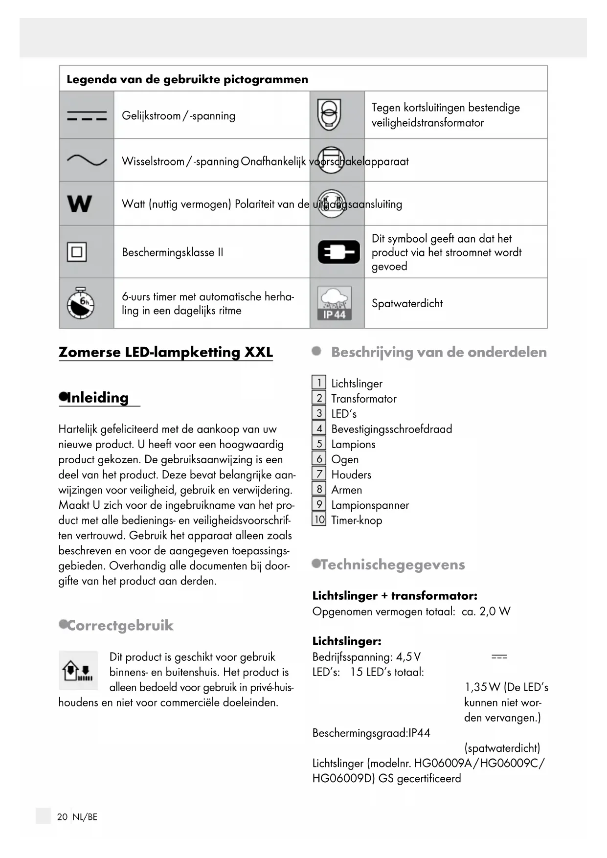 Neem de aanduiding van de verpak- kingsmaterialen voor de afvalscheiding in acht. Deze zijn gemarkeerd met de afkortingen (a) en een cijfers (b) met de volgende betekenis: 1–7: kunststoffen / 20–22: papier en vezelplaten / 80–98: composietmaterialen. Het product en de verpakkingsmaterialen zijn recyclebaar; verwijder deze afzon- derlijk voor een betere afvalbehandeling. Het Triman-logo geldt alleen voor Frankrijk. Informatie over de mogelijkheden om het uitgediende product na gebruik te verwijderen, verstrekt uw gemeentelijke overheid. Gooi het afgedankte product omwille van het milieu niet weg via het huisvuil, maar geef het af bij het daarvoor be- stemde depot of het gemeentelijke mili- eupark. Over afgifteplaatsen en hun openingstijden kunt u zich bij uw aan- gewezen instantie informeren. Garantie Het product wordt volgens strenge kwaliteitsricht- lijnen zorgvuldig geproduceerd en voor levering grondig getest. In geval van schade aan het pro- duct kunt u rechtmatig beroep doen op de verko- per van het product. Deze wettelijke rechten worden door onze hierna vermelde garantie niet beperkt. Op dit product verlenen wij 3 jaar garantie vanaf aankoopdatum. De garantieperiode start op de dag van aankoop. Bewaar de originele kassabon alstublieft. Dit document is nodig als bewijs voor aankoop. Wanneer binnen 3 jaar na de aankoopdatum van dit product een materiaal- of productiefout op- treedt, dan wordt het product door ons – naar onze keuze – gratis voor u gerepareerd of ver- vangen. Deze garantie komt te vervallen als het product beschadigd wordt, niet correct gebruikt of onderhouden wordt. De garantie geldt voor materiaal- en productiefou- ten. Deze garantie is niet van toepassing op pro- ductonderdelen, die onderhevig zijn aan normale slijtage en hierdoor als aan slijtage onderhevige onderdelen gelden (bijv. batterijen) of voor be- schadigingen aan breekbare onderdelen, zoals bijv. schakelaars, accu’s of dergelijke onderdelen, die gemaakt zijn van glas. Afwikkeling in geval van garantie Om een snelle afhandeling van uw reclamatie te waarborgen dient u de volgende instructies in acht te nemen: Houd bij alle vragen alstublieft de kassabon en het artikelnummer (bijv. IAN 123456_7890) als bewijs van aankoop bij de hand. Het artikelnummer vindt u op de typeplaat, inge- graveerd, op het titelblad van uw handleiding (links- onder) of als sticker op de achter- of onderzijde. Wanneer er storingen in de werking of andere ge- breken optreden, dient u eerst telefonisch of per e-mail contact met de onderstaande service-afde- ling op te nemen. Een als defect geregistreerd product kunt u dan samen met uw aankoopbewijs (kassabon) en vermelding van de concrete schade alsmede het tijdstip van optreden voor u franco aan het u meegedeelde servicepunt verzenden.24 NL/BE Service Service Nederland Tel.: 08000225537 E-Mail: owim@lidl.nl Service Belgiё Tel.: 080071011 Tel.: 80023970 (Luxemburg) E-Mail: owim@lidl.be25 PL Legenda zastosowanych piktogramów Prąd stały / napięcie stałe Odporny na zwarcie transformator bezpieczeństwa Prąd zmienny / napięcie zmienne Niezależne urządzenie sterujące Wat (moc czynna) Biegunowość wyjścia Klasa ochrony II Ten symbol wskazuje, ze produkt jest zasilany sieciowo 6-godzinny timer z automatycznym powtarzaniem w rytmie dziennym Ochrona przed pryskającą wodą Letnia girlanda świetlna z diodami LED XXL Wstęp Gratulujemy Państwu zakupu nowego produktu. Tym samym zdecydowali się Państwo na zakup produktu wysokiej jakości. Instrukcja obsługi jest częścią tego produktu. Zawiera ona ważne wska- zówki dotyczące bezpieczeństwa, użytkowania iutylizacji. Przed pierwszym użyciem produktu należy zapoznać się ze wszystkimi wskazówkami dotyczącymi obsługi ibezpieczeństwa. Używać produktu wyłącznie zgodnie zjego poniżej opisa- nym przeznaczeniem. Wprzypadku przekazania produktu innej osobie należy dołączyć do niego całą jego dokumentację. Zastosowanie zgodne z przeznaczeniem Produkt ten nadaje się do użytku zarówno w pomieszczeniach, jak i na zewnątrz. Produkt ten przeznaczony jest do za- stosowania jedynie w prywatnych gospodarstwach domowych, a nie w celach komercyjnych. Opis części