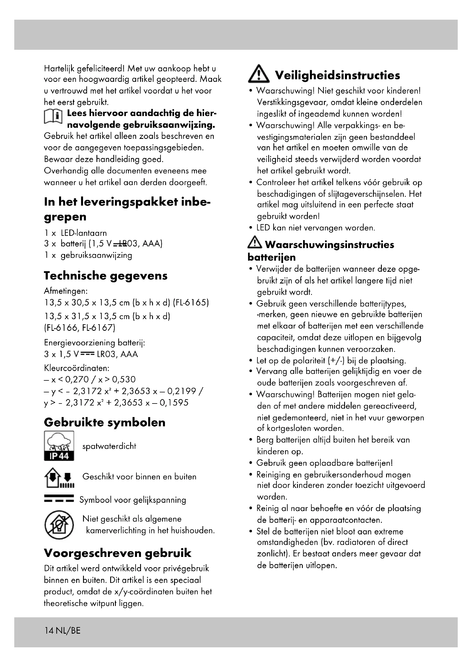 Batterijen vervangen Indien de batterijen niet meer functioneren, kunt u deze vervangen. Ga daarvoor te werk zoals in de paragraaf „Batterijen inleggen“. Neem de oude batterijen uit het batterijvak vooraleer nieuwe batterijen in te leggen. Licht in- en uitschakelen (afb. A) Schuif de schakelaar (1d) op ON om het artikel in te schakelen. Schuif de schakelaar (1d) op OFF om het artikel uit te schakelen. Schuif de schakelaar (1d) op TIMER om de timerfunctie van het artikel te activeren. Opmerking: Bij de timerfunctie is het licht 6 uur lang ingeschakeld en 18 uur lang uitgescha- keld. Gebruik Het artikel kan opgesteld of opgehangen worden. Opmerking: zet het artikel niet neer op gevoe- lige oppervlakken. Dit kan tot krassen leiden. Let bij het ophangen op het gewicht van het artikel. Opslag, reiniging Bij niet-gebruik het artikel droog en schoon zonder batterijen opbergen. Uitsluitend met een vochtige reinigingsdoek reinigen en vervolgens droogvegen. BELANGRIJK! Nooit met chemische reinigings- middelen reinigen. Aanwijzingen met het oog op de afvalverwijdering Voer het artikel en de verpakkingsmaterialen in overeenstemming met actuele plaatselijke voorschriften af. Verpakkingsmaterialen, zoals bv. foliezakjes, horen niet thuis in kinderhanden. Berg het verpakkingsmateriaal onbereikbaar voor kinderen op. Voer het artikel en de verpakking op milieuvriendelijke wijze af. De recyclingcode is een aanduiding waaraan u kunt zien, op welke manier de verschillende materialen voor recycling ingeleverd kunnen worden. De code bestaat uit het recyclingsymbool – dat de recyclingpro- cedure dient te weerspiegelen – en een nummer waarmee het materiaal aangeduid wordt. NL/BE16 NL/BE Apparaten die met het hiernaast afgebeel- de symbool gekenmerkt zijn, mogen niet samen met het huisvuil afgevoerd worden. U bent verplicht, dergelijke elektrische en elektro- nische apparaten afzonderlijk af te voeren. Gelieve u bij uw gemeente over de mogelijkhe- den van een geregelde afvalverwijdering te informeren. Verwijder vóór de afvalverwijdering de batterijen uit het artikel. Afvalverwijderingsmaatrege- len batterijen Gelieve in acht te nemen: Bij batterij- en gaat het om bijzonder afval dat volgens de wet niet samen met het huisvuil afgevoerd mag worden. U kunt onbruik- baar geworden batterijen kosteloos op de gemeentelijke inzamelpunten of in de handel afgeven. Hier staan speciale verzamelbakken ter beschikking. Opmerkingen over garantie en serviceafhandeling Het product is geproduceerd met grote zorg en onder voortdurende controle. U ontvangt een garantie van drie jaar op dit product, vanaf de datum van aankoop. Bewaar alstublieft uw aankoopbewijs. De garantie geldt alleen voor materiaal- en fabricagefouten en vervalt bij foutief of oneigenlijk gebruik. Uw wettelijke rechten, met name het garantierecht, worden niet beïnvloed door deze garantie. In geval van reclamaties dient u zich aan de beneden genoemde service-hotline te wenden of zich per e-mail met ons in verbinding te zetten. Onze servicemedewerkers zullen de verdere handelswijze zo snel mogelijk met u afspreken. Wij zullen u in ieder geval persoonlijk te woord staan. De garantieperiode wordt na eventuele reparaties en op basis van de garantie, wettelijke garantie of coulance niet verlengd. Dit geldt ook voor vervangen en gerepareerde delen. Na afloop van de garantieperiode dienen eventuele reparaties te worden betaald. IAN: 313564 Service België Tel.: 070 270 171 (0,15 EUR/Min.) E-Mail: deltasport@lidl.be Service Nederland Tel.: 0900 0400223 (0,10 EUR/Min.) E-Mail: deltasport@lidl.nl17 Herzlichen Glückwunsch! Mit Ihrem Kauf haben Sie sich für einen hochwertigen Artikel entschie- den. Machen Sie sich vor der ersten Verwen- dung mit dem Artikel vertraut. Lesen Sie hierzu aufmerksam die nachfolgende Gebrauchsanwei- sung. Benutzen Sie den Artikel nur wie beschrieben und für die angegebenen Einsatzbereiche. Bewahren Sie diese Anweisung gut auf. Händigen Sie alle Unterlagen bei Weitergabe des Artikels an Dritte ebenfalls mit aus. Lieferumfang 1 x LED-Laterne 3 x Batterie (1,5 V LR03, AAA) 1 x Gebrauchsanweisung Technische Daten Maße: 13,5 x 30,5 x 13,5 cm (B x H x T) (FL-6165) 13,5 x 31,5 x 13,5 cm (B x H x T) (FL-6166, FL-6167) Energieversorgung Batterie: 3 x 1,5 V LR03, AAA Farbwertanteile: — x < 0,270 / x > 0,530 — y < – 2,3172 x + 2,3653 x — 0,2199 / y > – 2,3172 x + 2,3653 x — 0,1595 Verwendete Symbole spritzwassergeschützt Für Innen und Außen geeignet Symbol für Gleichspannung Nicht zur allgemeinen Raumbeleuchtung im Haushalt geeignet. Bestimmungsgemäße Verwendung Dieser Artikel ist für den privaten Gebrauch im Innen- und Außenbereich konzipiert. Dieser Ar- tikel ist ein Spezialprodukt, weil die x/y-Koordi- naten außerhalb des theoretischen Weißpunktes liegen. Sicherheitshinweise
