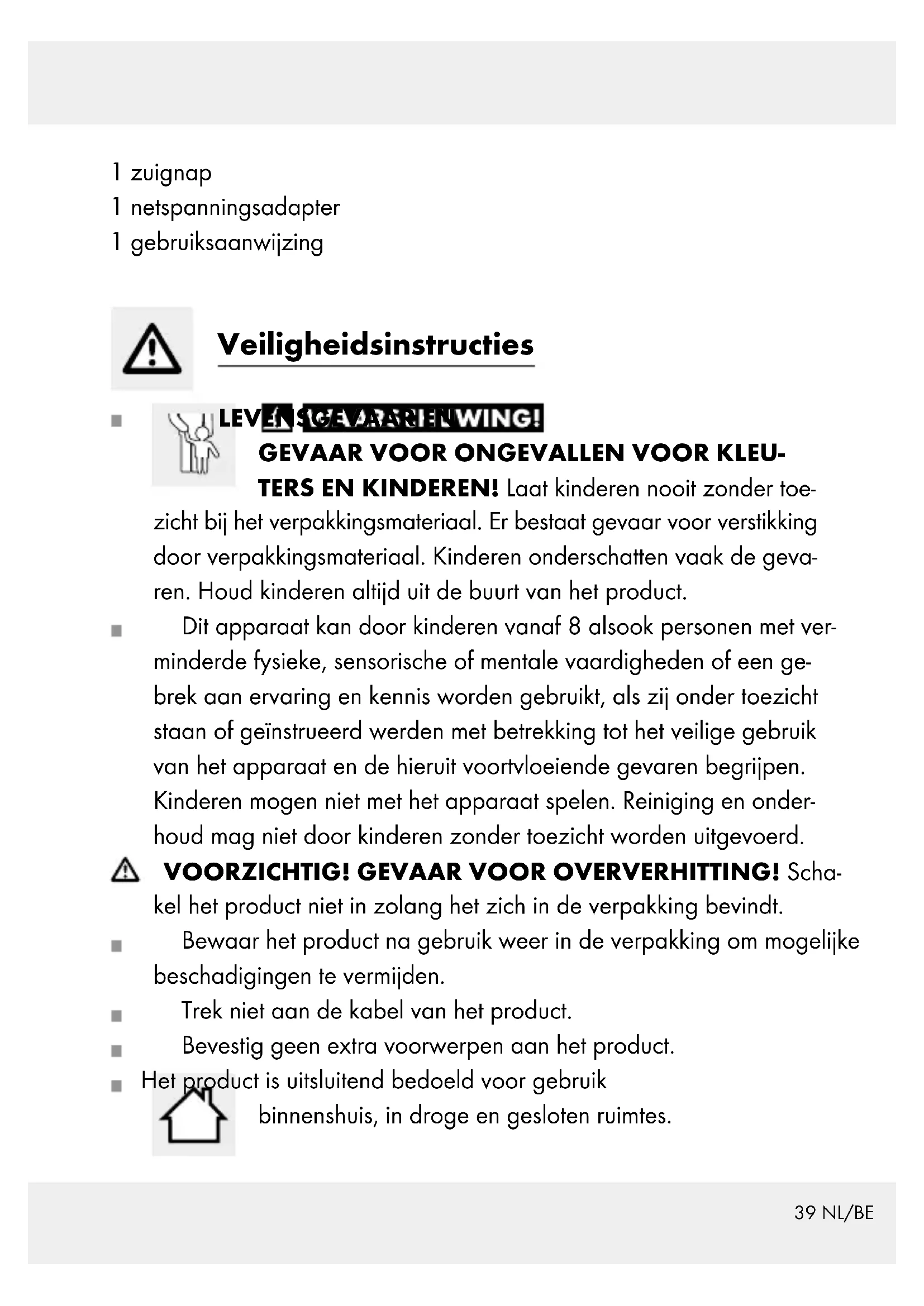 TERS EN KINDEREN! Laat kinderen nooit zonder toe- zicht bij het verpakkingsmateriaal. Er bestaat gevaar voor verstikking door verpakkingsmateriaal. Kinderen onderschatten vaak de geva- ren. Houd kinderen altijd uit de buurt van het product. Dit apparaat kan door kinderen vanaf 8 alsook personen met ver- minderde fysieke, sensorische of mentale vaardigheden of een ge- brek aan ervaring en kennis worden gebruikt, als zij onder toezicht staan of geïnstrueerd werden met betrekking tot het veilige gebruik van het apparaat en de hieruit voortvloeiende gevaren begrijpen. Kinderen mogen niet met het apparaat spelen. Reiniging en onder- houd mag niet door kinderen zonder toezicht worden uitgevoerd. VOORZICHTIG! GEVAAR VOOR OVERVERHITTING! Scha- kel het product niet in zolang het zich in de verpakking bevindt. Bewaar het product na gebruik weer in de verpakking om mogelijke beschadigingen te vermijden. Trek niet aan de kabel van het product. Bevestig geen extra voorwerpen aan het product. Het product is uitsluitend bedoeld voor gebruik binnenshuis, in droge en gesloten ruimtes.40 NL/BE Vermijd levensgevaar door elektrische schokken! Overtuig u er vóór het gebruik van dat de bestaande netspanning overeenstemt met de vereiste bedrijfsspanning van het product (230–240 V∼). Controleer de netspanningsadapter