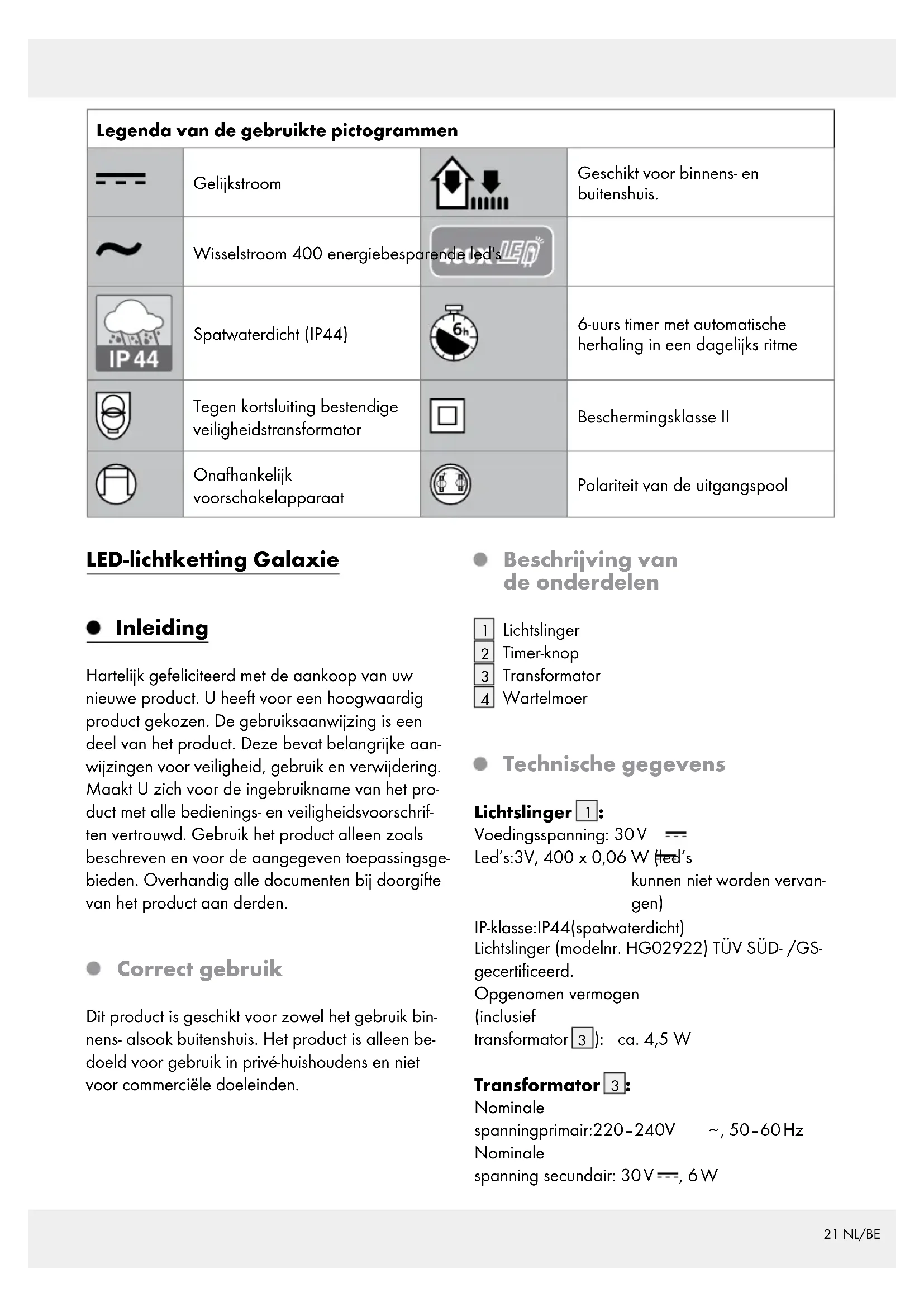 , 50–60 Hz Nominale spanning secundair: 30 V , 6 W22 NL/BE Beschermingsklasse: IP-klasse: IP44 (spatwaterdicht) Transformator (modelnr. JT-DC30V6W-H1-IP44) SGS / GS gekeurd. Omvang van de levering 1 lichtslinger 1 transformator 1 gebruiksaanwijzing Veiligheidsinstructies