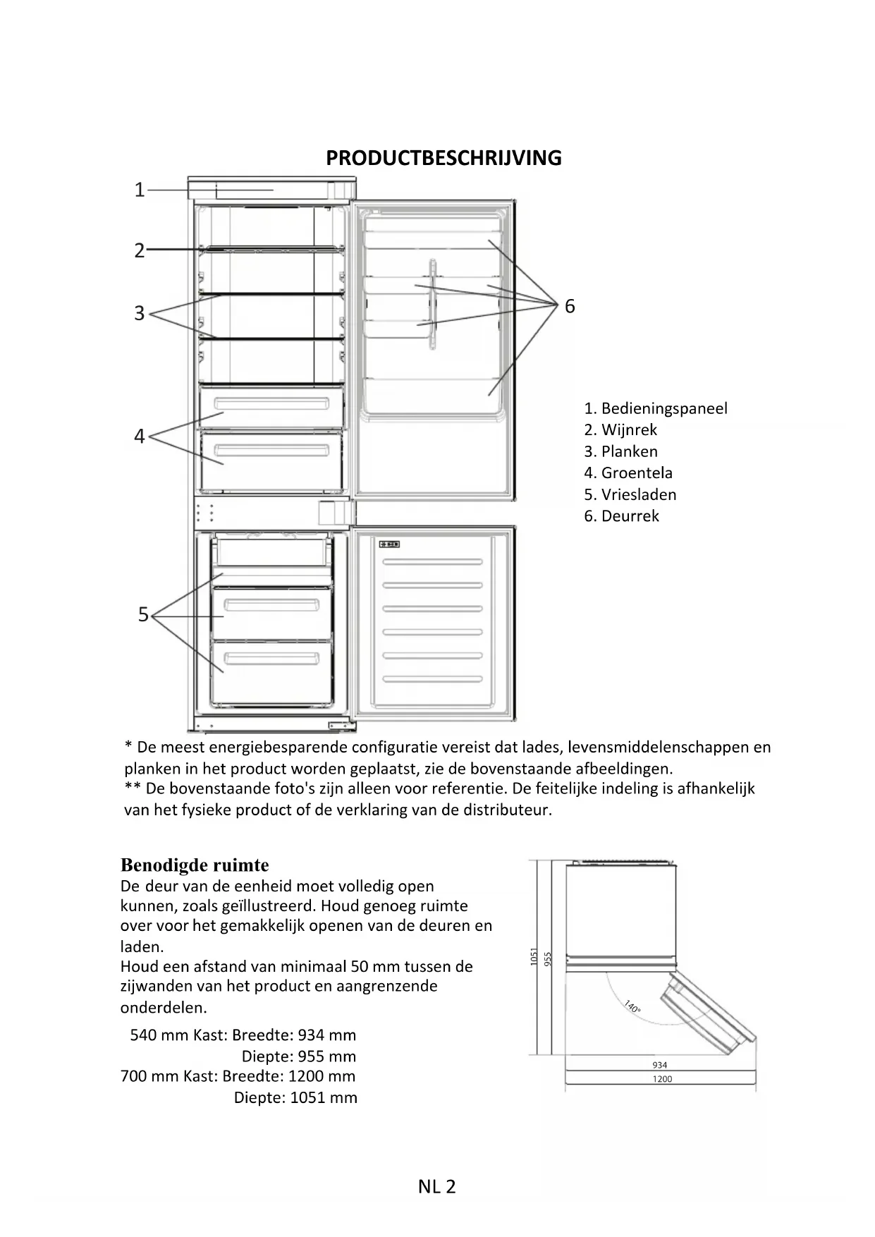 7PRODUCTBESCHRIJVING 1. Bedieningspaneel2. Wijnrek3. Planken4. Groentela5. Vriesladen6. Deurrek* De meest energiebesparende configuratie vereist dat lades, levensmiddelenschappen enplanken in het product worden geplaatst, zie de bovenstaande afbeeldingen.** De bovenstaande foto's zijn alleen voor referentie. De feitelijke indeling is afhankelijk van het fysieke product of de verklaring van de distributeur.Benodigde ruimte De deur van de eenheid moet volledig open kunnen, zoals geïllustreerd. Houd genoeg ruimte over voor het gemakkelijk openen van de deuren en laden. Houd een afstand van minimaal 50 mm tussen de zijwanden van het product en aangrenzende onderdelen.540 mm Kast: Breedte: 934 mmDiepte: 955 mm700 mm Kast: Breedte: 1200 mmDiepte: 1051 mm