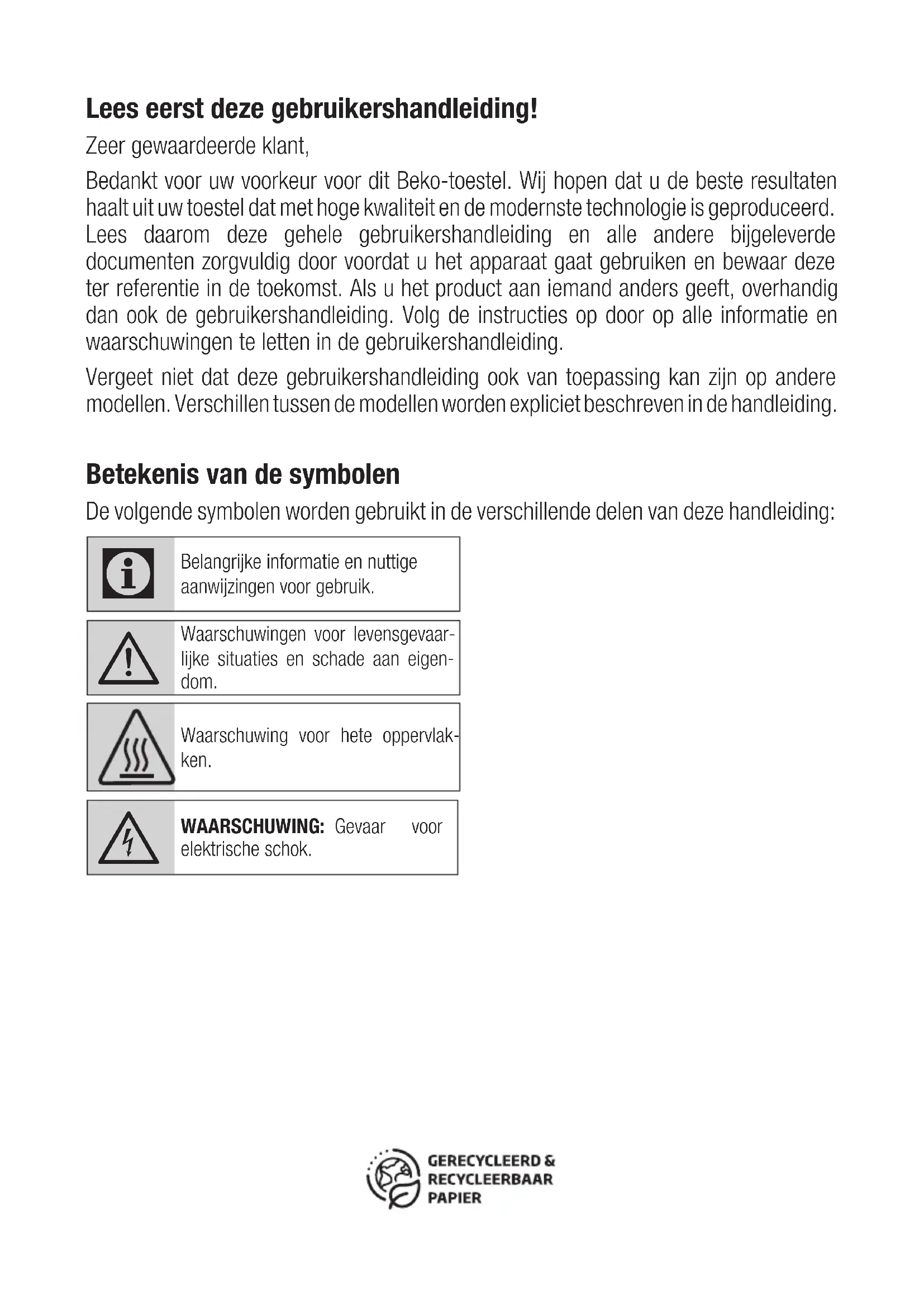 O fiador e o importador do seu eletrodoméstico é: Beko Portugal, Unipessoal, Lda.; Espaço Amoreiras – Centro Empresarial Rua D. João V nº 24, 0.01 1250-091, Lisboa, Portugal. Conheça-nos melhor na nossa página: www.beko.com Conserve este documento, é importante para si. (*) São considerados eletrodomésticos da linha branca, os aparelhos de cozinha, limpeza, refrigeração e ventilação de tamanho grande e pequenos eletrodomésticos, os de higiene pessoal, manutenção do lar e preparação de alimentos.Lees eerst deze gebruikershandleiding! Zeer gewaardeerde klant, Bedankt voor uw voorkeur voor dit Beko-toestel. Wij hopen dat u de beste resultaten haalt uit uw toestel dat met hoge kwaliteit en de modernste technologie is geproduceerd. Lees daarom deze gehele gebruikershandleiding en alle andere bijgeleverde documenten zorgvuldig door voordat u het apparaat gaat gebruiken en bewaar deze ter referentie in de toekomst. Als u het product aan iemand anders geeft, overhandig dan ook de gebruikershandleiding. Volg de instructies op door op alle informatie en waarschuwingen te letten in de gebruikershandleiding. Vergeet niet dat deze gebruikershandleiding ook van toepassing kan zijn op andere modellen. Verschillen tussen de modellen worden expliciet beschreven in de handleiding. Betekenis van de symbolen De volgende symbolen worden gebruikt in de verschillende delen van deze handleiding: