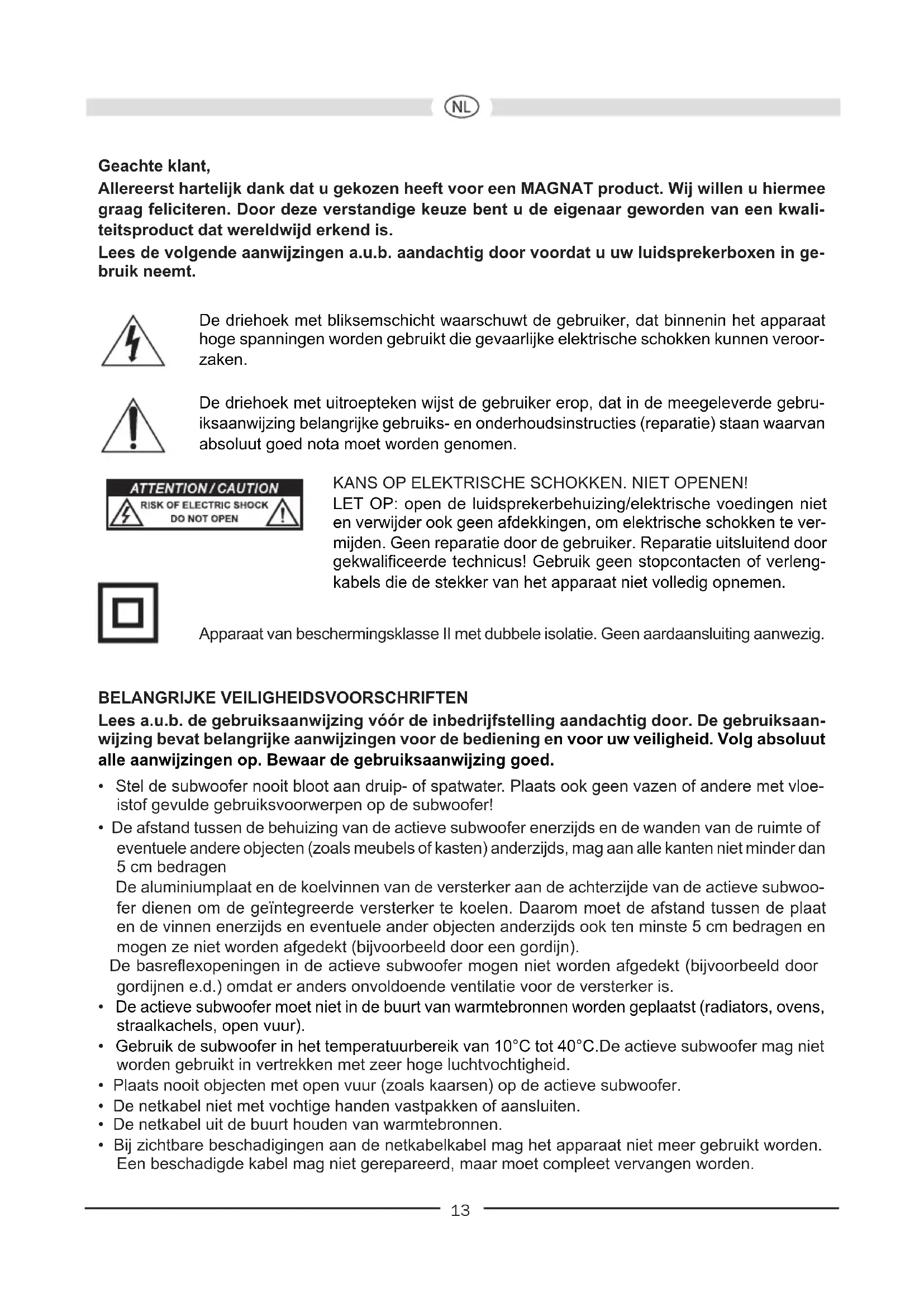 Alpha RS 8 Alpha RS 12 Conguration: Bass reflex, configuration Frontfire Bass reflex, configuration Frontfire Equipement: 200 mm woofer 300 mm woofer Puissance de sortie RMS/Max.: 80 / 160 Watt 120 / 240 Watt Bande passante: 25 – 200 Hz 20 – 200 Hz Fréquence séparatrice: 50 – 150 Hz, réglable 50 – 150 Hz, réglable Dimensions (LxHxP): 260 x 350 x 370 mm 360 x 485 x 460 mm Accessoires: Câble secteur Câble secteur Sous toutes réserves de modications techniques.13 Geachte klant, Allereerst hartelijk dank dat u gekozen heeft voor een MAGNAT product. Wij willen u hiermee graag feliciteren. Door deze verstandige keuze bent u de eigenaar geworden van een kwali- teitsproduct dat wereldwijd erkend is. Lees de volgende aanwijzingen a.u.b. aandachtig door voordat u uw luidsprekerboxen in ge- bruik neemt. De driehoek met bliksemschicht waarschuwt de gebruiker, dat binnenin het apparaat hoge spanningen worden gebruikt die gevaarlijke elektrische schokken kunnen veroor- zaken. De driehoek met uitroepteken wijst de gebruiker erop, dat in de meegeleverde gebru- iksaanwijzing belangrijke gebruiks- en onderhoudsinstructies (reparatie) staan waarvan absoluut goed nota moet worden genomen. KANS OP ELEKTRISCHE SCHOKKEN. NIET OPENEN! LET OP: open de luidsprekerbehuizing/elektrische voedingen niet en verwijder ook geen afdekkingen, om elektrische schokken te ver- mijden. Geen reparatie door de gebruiker. Reparatie uitsluitend door gekwalificeerde technicus! Gebruik geen stopcontacten of verleng- kabels die de stekker van het apparaat niet volledig opnemen. Apparaat van beschermingsklasse II met dubbele isolatie. Geen aardaansluiting aanwezig. BELANGRIJKE VEILIGHEIDSVOORSCHRIFTEN Lees a.u.b. de gebruiksaanwijzing vóór de inbedrijfstelling aandachtig door. De gebruiksaan- wijzing bevat belangrijke aanwijzingen voor de bediening en voor uw veiligheid. Volg absoluut alle aanwijzingen op. Bewaar de gebruiksaanwijzing goed.