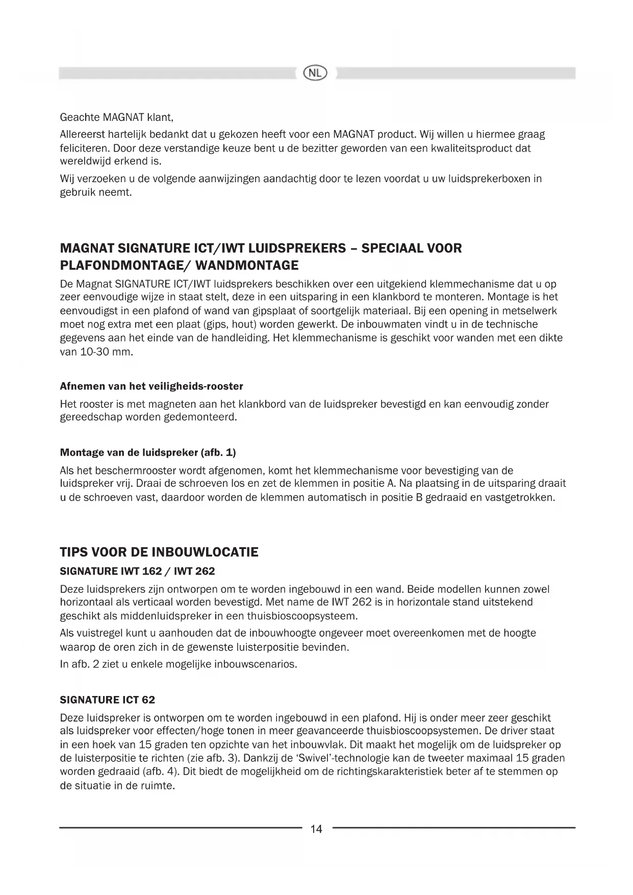 Deze luidsprekers zijn ontworpen om te worden ingebouwd in een wand. Beide modellen kunnen zowel horizontaal als verticaal worden bevestigd. Met name de IWT 262 is in horizontale stand uitstekend geschikt als middenluidspreker in een thuisbioscoopsysteem. Als vuistregel kunt u aanhouden dat de inbouwhoogte ongeveer moet overeenkomen met de hoogte waarop de oren zich in de gewenste luisterpositie bevinden. In afb. 2 ziet u enkele mogelijke inbouwscenarios. SIGNATURE ICT 62 Deze luidspreker is ontworpen om te worden ingebouwd in een plafond. Hij is onder meer zeer geschikt als luidspreker voor effecten/hoge tonen in meer geavanceerde thuisbioscoopsystemen. De driver staat in een hoek van 15 graden ten opzichte van het inbouwvlak. Dit maakt het mogelijk om de luidspreker op de luisterpositie te richten (zie afb. 3). Dankzij de ‘Swivel’-technologie kan de tweeter maximaal 15 graden worden gedraaid (afb. 4). Dit biedt de mogelijkheid om de richtingskarakteristiek beter af te stemmen op de situatie in de ruimte.15 ENKELE ALGEMENE OPMERKINGEN OVER HET AANSLUITEN VAN UW MAGNAT LUIDSPREKERBOXEN Voor het aansluiten van de luidsprekerboxen heeft u speciale bij de vakhandel verkrijgbare luidsprekerkabels nodig. Om klankverlies te voorkomen, adviseren wij voor kabels tot 3 m een kabeldiameter van minimaal 1 mm² en voor langere kabels een kabeldiameter van minimaal 1,5 mm². De versterker resp. receiver moet principieel uitgeschakeld blijven tot alle verbindingen tot stand zijn gebracht. Voor het afmeten van de juiste kabellengte moeten de luidsprekerboxen op hun uiteindelijke standplaats staan. Voor beide kanalen moeten even lange kabels worden gebruikt. Strip nu de uiteinden van de kabel over een lengte van 10 – 15 mm en twist de uiteinden in elkaar.De luidsprekeraansluitingen zijn uitgerust met een klemmechanisme (afb. 5). Druk op de klemkop en breng het gestripte draaduiteinde in de opening aan de zijkant naar binnen. Door loslaten van de klemkop wordt de kabel veilig vastgezet en een zo goed mogelijk contact gewaarborgd. Let er bij het aansluiten van de kabels vooral op dat u de polen niet omdraait, d.w.z. de zwarte (-) klemmen van de luidsprekerboxen moeten verbonden worden met de (-) klemmen van de versterker en de rode (+) klemmen van de luidsprekerboxen met de (+) klemmen van de versterker. Om het aansluiten in fase te vergemakkelijken, is bij de meeste luidsprekerkabels één kabelader voorzien van een randje of gemarkeerd met een gekleurde streep. Controleer tot slot nog eens of de kabels goed vastzitten en er geen kortsluiting is ontstaan, bijv. door uitstekende draadjes. Dit zou voor de aangesloten versterker bijzonder gevaarlijk zijn. HOGE-TONENINSTELLING (AFB. 6) Hoogwaardige schakelaars op de front van de crossover bieden de mogelijkheid om de klank van het luidsprekersysteem af te stemmen op uw individuele wensen. Het wordt aanbevolen een instelling te kiezen die optimaal aansluit op de persoonlijke smaak. We raden de volgende standen voor de schakelaar aan voor verschillende ruimten: Ruimte Voorbeeld Schakelstand Ruimten met weinig geluidsdemping Harde reecterende vlakken, tegels, grote glasvlakken, spaarzaam ingerichte ruimten -3dB Ruimten met normale geluidsdemping Vloerbedekking, glasvlakken met vitrage, leren stoffering, ruimten met een normale inrichting 0dB Ruimten met veel geluidsdemping Vloerbedekking, wandbekleding, zware gordijnen, ruimten met een uitgebreide inrichting +3dB