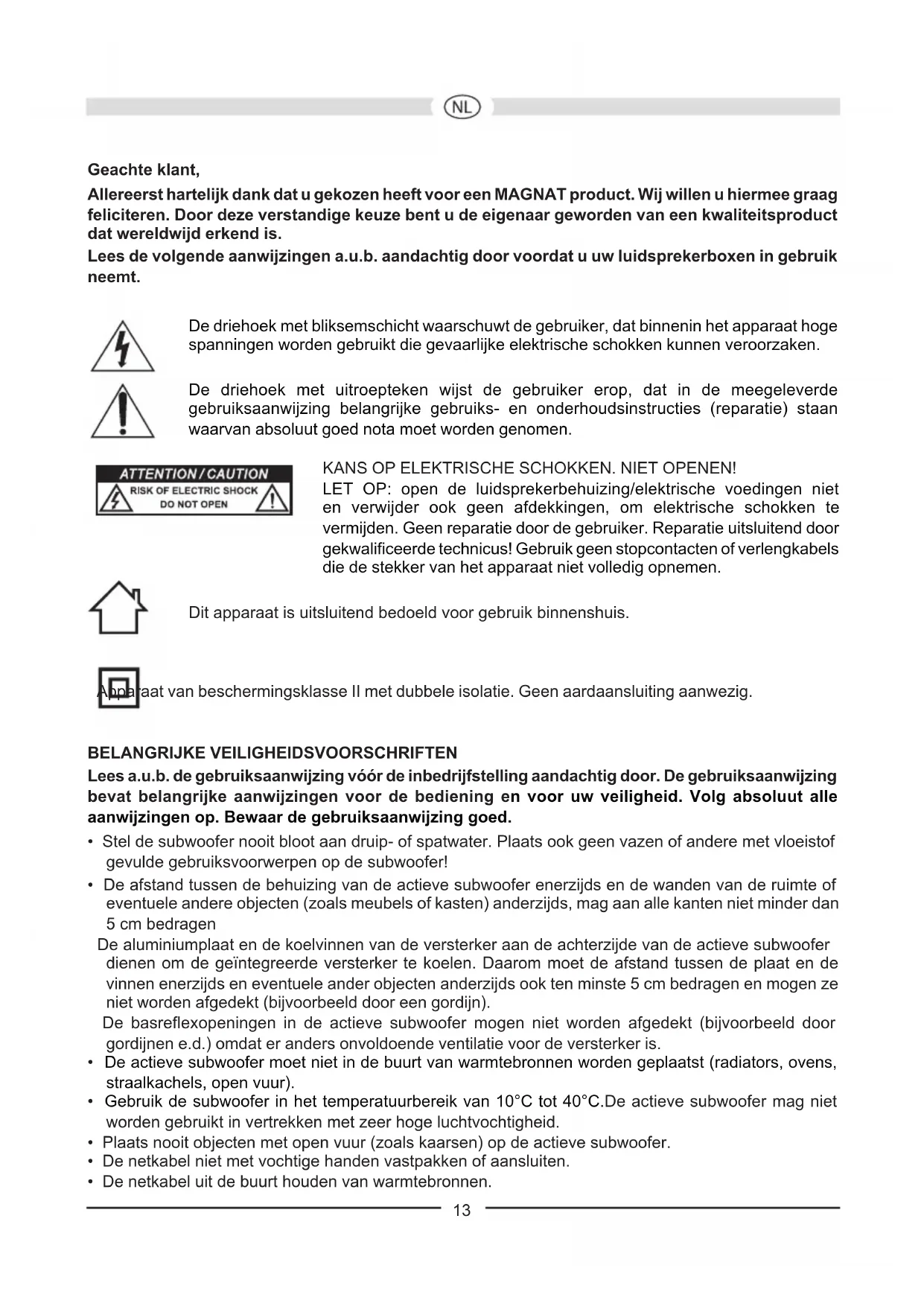 Régulateur de fréquence séparatrice (4) Ce réglage détermine la limite supérieure de la bande de fréquences reproduites par le subwoofer. En combinaison avec des haut-parleurs installés sur des étagères, la fréquence devrait être réglée entre 40 Hz et 200 Hz. Si vous utilisez des haut-parleurs colonne, un réglage entre 50 Hz et 100 Hz est alors ingénieux. Régulateur de phase (3) Normalement, le régulateur de phase doit être placé sur 0°. Dans des cas assez rares, il peut parfois être avanta-geux de faire varier la phase entre 0° et 180° (par exemple en cas de grande distance entre le subwoofer et les satellites frontaux ou si la pièce n’est pas bien conçue acoustiquement). En général: la position où la zone des sons de base sonne le plus naturel est la bonne. Fusible (9) Utilisez exclusivement des fusibles du type indiqué sur le côté arrière de l’amplificateur à coté du porte- fusible sur l’arrière. ENTRETIEN Nettoyez les surfaces avec un produit d‘entretien ménager doux, et n‘utilisez surtout pas un vernis pour meuble ou similaire. SPECIFICATIONS TECHNIQUES Configuration: bass reflex subwoofer, ‘Frontfire’ Equipement : pilote d’élévation longue 30 cm Puissance de sortie RMS/Max.: 220 / 440 Watt Bande passante: 18 – 200 Hz Fréquence séparatrice: 40 – 200 Hz réglable Dimensions (LxHxP): 400 x 570 x 510 mm Accessoires: câble secteur Sous toutes réserves de modifications techniques.13 Geachte klant, Allereerst hartelijk dank dat u gekozen heeft voor een MAGNAT product. Wij willen u hiermee graag feliciteren. Door deze verstandige keuze bent u de eigenaar geworden van een kwaliteitsproduct dat wereldwijd erkend is. Lees de volgende aanwijzingen a.u.b. aandachtig door voordat u uw luidsprekerboxen in gebruik neemt. De driehoek met bliksemschicht waarschuwt de gebruiker, dat binnenin het apparaat hoge spanningen worden gebruikt die gevaarlijke elektrische schokken kunnen veroorzaken. De driehoek met uitroepteken wijst de gebruiker erop, dat in de meegeleverde gebruiksaanwijzing belangrijke gebruiks- en onderhoudsinstructies (reparatie) staan waarvan absoluut goed nota moet worden genomen. KANS OP ELEKTRISCHE SCHOKKEN. NIET OPENEN! LET OP: open de luidsprekerbehuizing/elektrische voedingen niet en verwijder ook geen afdekkingen, om elektrische schokken te vermijden. Geen reparatie door de gebruiker. Reparatie uitsluitend door gekwalificeerde technicus! Gebruik geen stopcontacten of verlengkabels die de stekker van het apparaat niet volledig opnemen. Dit apparaat is uitsluitend bedoeld voor gebruik binnenshuis. Apparaat van beschermingsklasse II met dubbele isolatie. Geen aardaansluiting aanwezig. BELANGRIJKE VEILIGHEIDSVOORSCHRIFTEN Lees a.u.b. de gebruiksaanwijzing vóór de inbedrijfstelling aandachtig door. De gebruiksaanwijzing bevat belangrijke aanwijzingen voor de bediening en voor uw veiligheid. Volg absoluut alle aanwijzingen op. Bewaar de gebruiksaanwijzing goed.