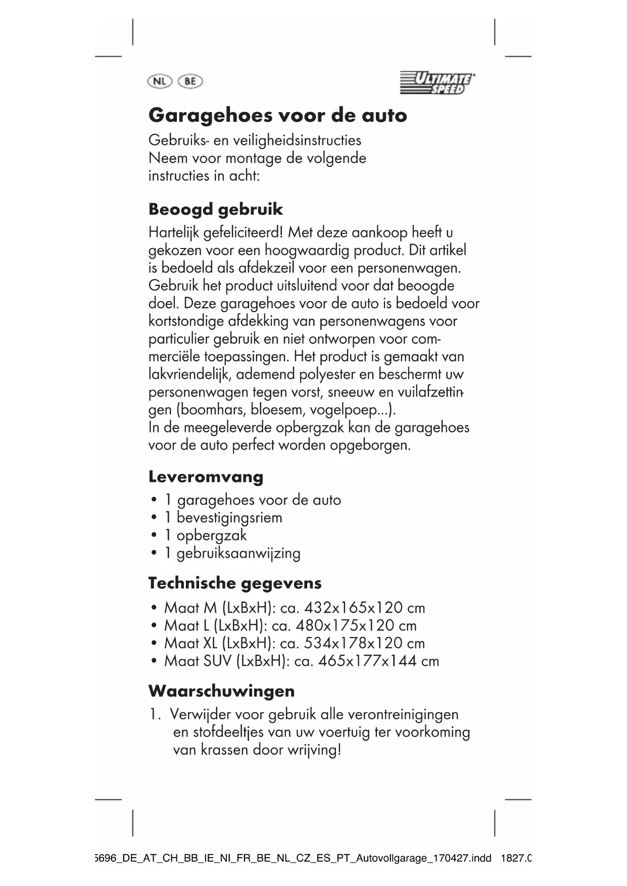 en stofdeeltjes van uw voertuig ter voorkoming van krassen door wrijving! Garagehoes voor de auto Gebruiks- en veiligheidsinstructies Neem voor montage de volgende instructies in acht: 285696_DE_AT_CH_BB_IE_NI_FR_BE_NL_CZ_ES_PT_Autovollgarage_170427.indd 1827.04.17 11:012. Let er bij het aanbrengen op dat de riemgespen de lak niet beschadigen.