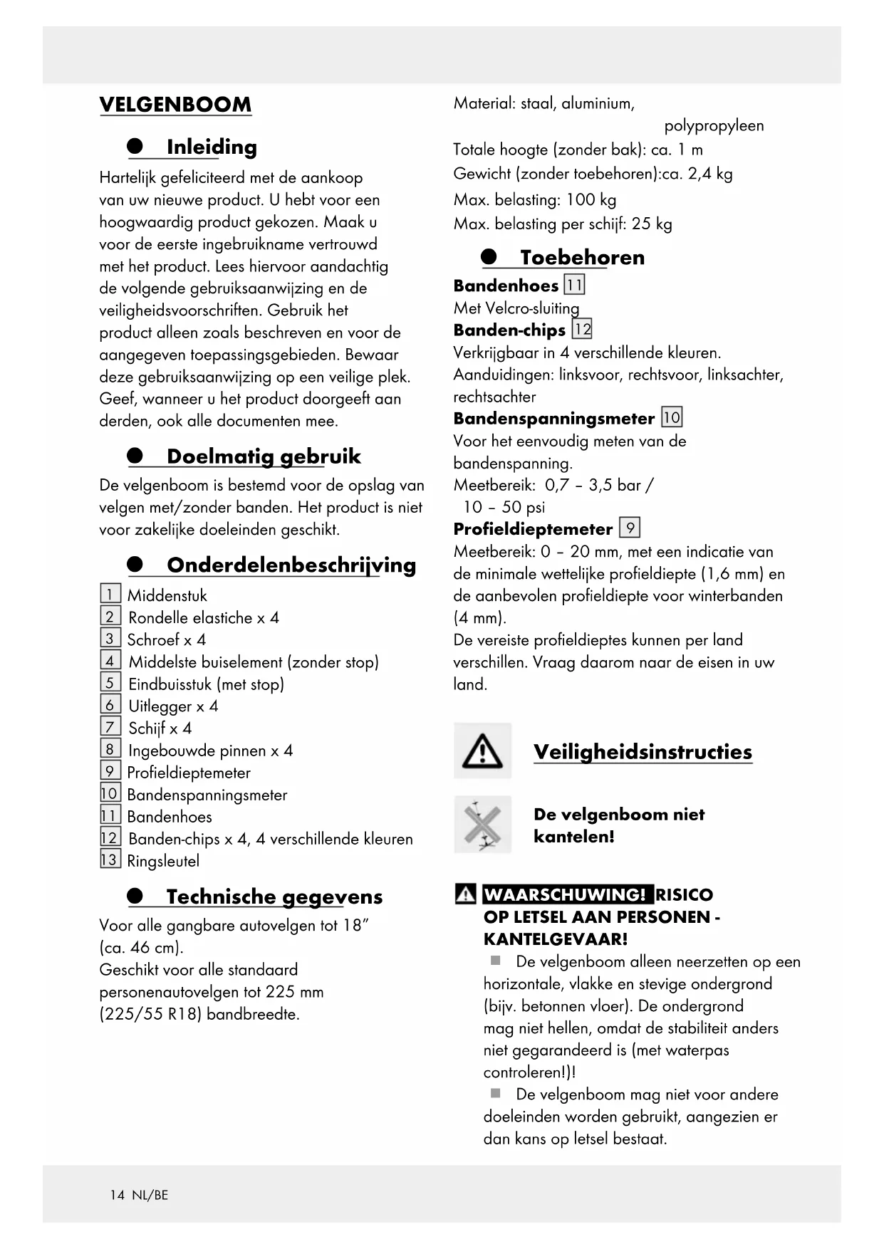 KANTELGEVAAR! De velgenboom alleen neerzetten op een horizontale, vlakke en stevige ondergrond (bijv. betonnen vloer). De ondergrond mag niet hellen, omdat de stabiliteit anders niet gegarandeerd is (met waterpas controleren!)! De velgenboom mag niet voor andere doeleinden worden gebruikt, aangezien er dan kans op letsel bestaat.15 NL/BE Bij verplaatsingen de velgenboom altijd zonder last (velgen en banden) op een andere plaats neerzetten vanwege het kantelgevaar. Het kantelen van de velgenboom is verboden, aangezien dit tot letsel kan leiden. De velgenboom mag bij een defect niet verder worden gebruikt vanwege de kans op letsel. Bedien de velgenboom altijd met twee handen.