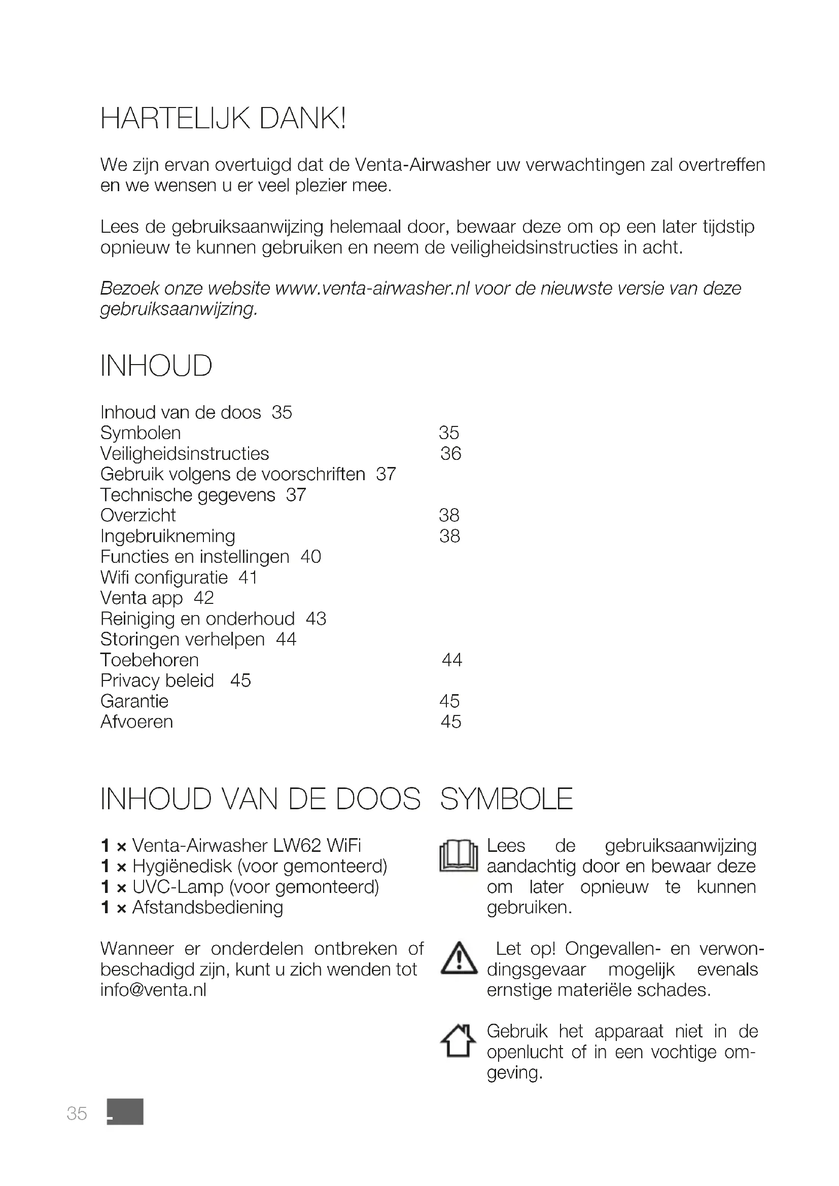 1 × Venta-Airwasher LW62 WiFi 1 × Hygiënedisk (voor gemonteerd) 1 × UVC-Lamp (voor gemonteerd) 1 × Afstandsbediening Wanneer er onderdelen ontbreken of beschadigd zijn, kunt u zich wenden tot info@venta.nl INHOUD Inhoud van de doos 35 Symbolen 35 Veiligheidsinstructies 36 Gebruik volgens de voorschriften 37 Technische gegevens 37 Overzicht 38 Ingebruikneming 38 Functies en instellingen 40 Wi conguratie 41 Venta app 42 Reiniging en onderhoud 43 Storingen verhelpen 44 Toebehoren 44 Privacy beleid 45 Garantie 45 Afvoeren 4536NLVenta LW62 WiFi ∙ Dit apparaat is geschikt voor gebruik door kinderen vanaf 8 jaar en personen met beperkte lichamelijke, sensorische of mentale capaciteiten of met een gebrek- kige ervaring en kennis, wanneer zij on- der toezicht staan of met betrekking tot een veilig gebruik van het apparaat wer- den geïnstrueerd en de bestaande geva- ren hebben begrepen. ∙ Het apparaat is geen speelgoed voor kin- deren. ∙ Reiniging en onderhoud door de gebrui- ker mogen niet worden uitgevoerd door kinderen jonger dan 8 jaar of zonder toe- zicht. ∙ Houd het apparaat en het stroomkabel uit de buurt van kinderen jonger dan 8 jaar. ∙ Een ondeskundig gebruik kan het appa- raat beschadigen en verwondingen ver- oorzaken. ∙ Lees de gebruiksaanwijzing vóór inge- bruikname volledig door en bewaar deze zorgvuldig om later opnieuw te kunnen raadplegen. ∙ Sluit het apparaat alleen aan op geschik- te stopcontacten – netspanning volgens de gegevens op het typeplaatje van het apparaat. ∙ Trek de stekker uit het stopcontact al- vorens reinigings- of onderhoudswerk- zaamheden uit te voeren en ook wanneer het apparaat wordt verplaatst of getrans- porteerd. ∙ Neem de Airwasher nooit in gebruik wan- neer het aansluitsnoer beschadigd is. ∙ Vervangende aansluitsnoeren moeten voldoen aan het type “IEC-connector 60320 C5”. ∙ Neem de Airwasher nooit in gebruik wan- neer deze is gevallen of op een andere manier werd beschadigd. ∙ Reparaties aan elektrische apparaten mogen alleen worden uitgevoerd door erkende elektriciens. Door onvakkundig uitgevoerde reparaties kunnen aanzien- lijke gevaren voor de gebruiker ontstaan. ∙ Ga in geen geval op het apparaat zitten en leg er geen voorwerpen op. ∙ Steek geen vreemde voorwerpen in het apparaat. ∙ Dompel het apparaat nooit in water of an- dere vloeistoen. ∙ Trek de stekker nooit aan het snoer en ook niet met natte handen uit het stop- contact. ∙ De Airwasher mag alleen in compleet ge- monteerde toestand in gebruik worden genomen. ∙ Plaats de Airwasher alleen op een vlakke, droge ondergrond. ∙ Houd ten opzichte van voorwerpen en wanden een minimale afstand aan de zijkant van ten minste 20 cm en aan de bovenkant 50 cm aan. ∙ Zet het apparaat zodanig neer dat het niet kan worden omgestoten en dat er nie- mand over het apparaat of over het snoer kan struikelen. ∙ Trek de stekker uit het stopcontact wan- neer u het apparaat niet gebruikt. ∙ Blokkeer de ventilatiesleuf niet en dek deze ook niet af, om oververhitting/be- schadiging van het apparaat te voorko- men. ∙ De Airwasher nooit te vol vullen. ∙ De Airwasher niet vervoeren of kantelen met een volle tank. ∙ Nooit direct in de UVC-lamp kijken. ∙ De UVC-lamp nooit manipuleren ∙ Indien de stroomkabel en/of UVC-lamp beschadigd is, dient het apparaat niet in gebruik genomen te worden. ∙ In het water mogen geen geuroliën wor- den toegevoegd, aangezien dit de functie van hygiëne-Disk nadelig kan beïnvlo- eden. ∙ Schade, welke is veroorzaakt door het gebruik van vreemde additieven, hierdoor vervalt de garantie van Venta-Luftwä- scher GmbH. VEILIGHEIDSINSTRUCTIES37 NL