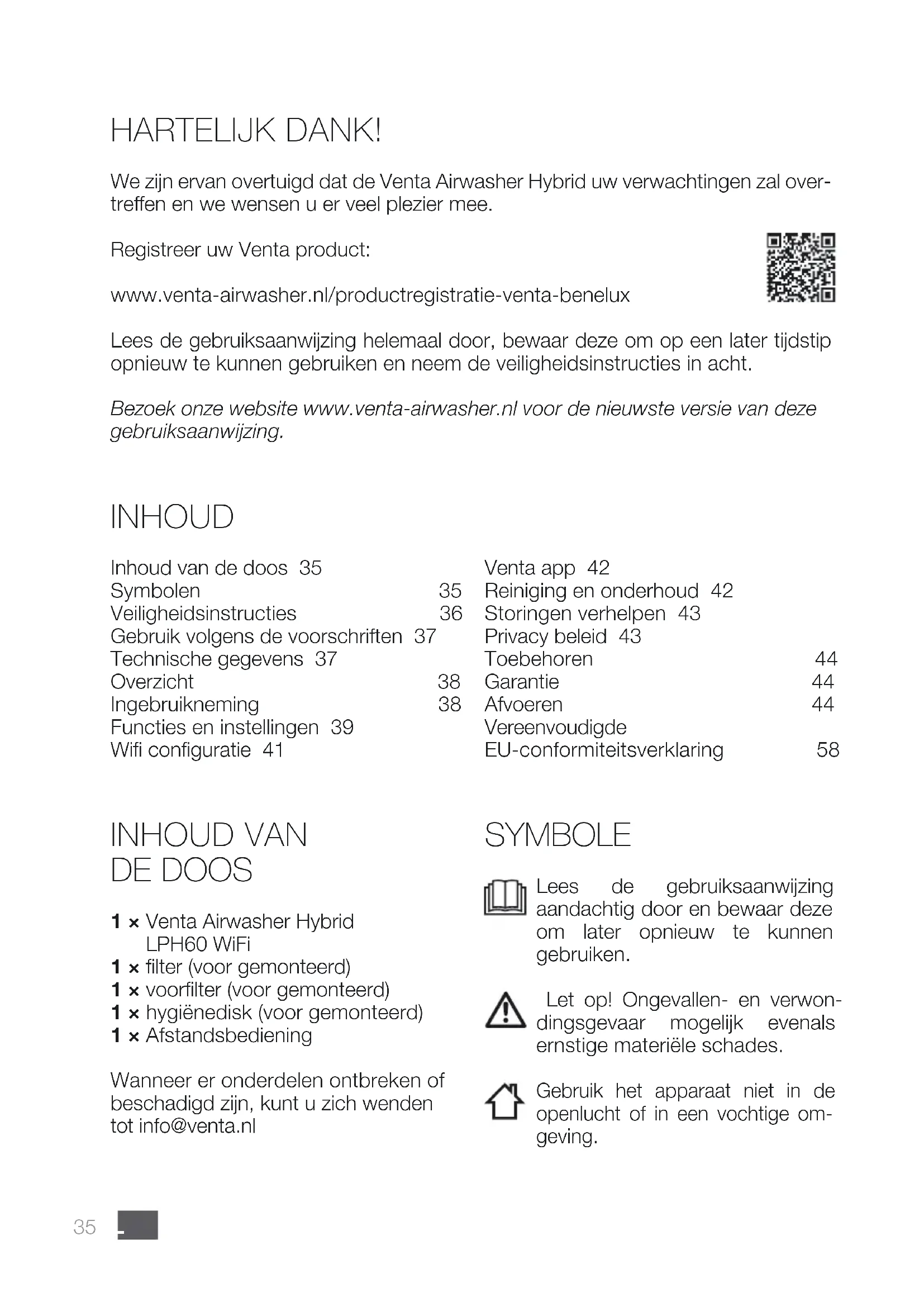 En cas de changement de vos données personnelles ou de vos préférences commerciales ou si vous avez des questions à poser sur notre utilisation des informations vous concernant, veuillez nous en informer en contactant CH Venta-Luftwäscher AG, Bösch 65, CH-6331 Hünenberg, 041 781 15 15, service@venta-luftwaescher.ch NL Van Heemstraweg Oost 8, NL-5301KE Zaltbommel, 0418 54 13 43, info@venta.nl Pour plus de renseignements concernant notre protection de votre vie privée, veuillez consulter notre politique de protection sur www.venta-luftwaescher.ch ou sur www.venta-airwasher.nl GARANTIE En raison de la grande qualité du produit, Venta-Luftwäscher GmbH garantit pour une période de deux ans à compter de la date d‘achat que ce produit est exempt de défauts s‘il est utilisé correctement. Dans le cas improbable où un défaut de matériau ou de fabrication se produirait, veuillez contacter l‘équipe de service VENTA ou votre revendeur. En outre, les conditions générales de garantie de Venta s‘appliquent : www.venta-luftwaescher.ch/service/garantie/, www.venta-airwasher.nl/service/garantie/ ÉLIMINATION Le symbole de « poubelle barrée » requiert l’élimination séparée des dé- chets d’équipements électriques et électroniques (DEEE) et des piles usa- gées. De tels appareils peuvent contenir des substances dangereuses et polluantes. Ces produits doivent être rapportés dans un centre de collecte approprié pour le recyclage d’équipements électriques et électroniques et ne doivent pas être éliminés avec les ordures ménagères non triées. Ne jetez pas les piles usa- gées à la poubelle. Déposez-les dans les lieux de collecte prévus à cet eet. Vous contribuez ainsi à la protection des ressources et de l’environnement. Pour toute information complémentaire, veuillez vous adresser aux autorités locales. Les enfants ne doivent en aucun cas jouer avec des sacs en plastique et maté- riels d’emballage du fait du risque de blessures et d’asphyxie. Stocker ce type de matériel en sécurité ou l’éliminer de manière écologique.35 NL SYMBOLE Lees de gebruiksaanwijzing aandachtig door en bewaar deze om later opnieuw te kunnen gebruiken. Let op! Ongevallen- en verwon- dingsgevaar mogelijk evenals ernstige materiële schades. Gebruik het apparaat niet in de openlucht of in een vochtige om- geving. INHOUD VAN DE DOOS 1 × Venta Airwasher Hybrid LPH60 WiFi 1 × lter (voor gemonteerd) 1 × voorlter (voor gemonteerd) 1 × hygiënedisk (voor gemonteerd) 1 × Afstandsbediening Wanneer er onderdelen ontbreken of beschadigd zijn, kunt u zich wenden tot info@venta.nl INHOUD Inhoud van de doos 35 Symbolen 35 Veiligheidsinstructies 36 Gebruik volgens de voorschriften 37 Technische gegevens 37 Overzicht 38 Ingebruikneming 38 Functies en instellingen 39 Wi conguratie 41 Venta app 42 Reiniging en onderhoud 42 Storingen verhelpen 43 Privacy beleid 43 Toebehoren 44 Garantie 44 Afvoeren 44 Vereenvoudigde EU-conformiteitsverklaring 58 HARTELIJK DANK! We zijn ervan overtuigd dat de Venta Airwasher Hybrid uw verwachtingen zal over- treen en we wensen u er veel plezier mee. Registreer uw Venta product: www.venta-airwasher.nl/productregistratie-venta-benelux Lees de gebruiksaanwijzing helemaal door, bewaar deze om op een later tijdstip opnieuw te kunnen gebruiken en neem de veiligheidsinstructies in acht. Bezoek onze website www.venta-airwasher.nl voor de nieuwste versie van deze gebruiksaanwijzing.36NLVenta LPH60 WiFi ∙ Dit apparaat is geschikt voor gebruik door kinderen vanaf 8 jaar en personen met beperkte lichamelijke, sensorische of mentale capaciteiten of met een ge- brekkige ervaring en kennis, wanneer zij onder toezicht staan of met betrekking tot een veilig gebruik van het apparaat werden geïnstrueerd en de bestaande gevaren hebben begrepen. ∙ Het apparaat is geen speelgoed voor kinderen. ∙ Reiniging en onderhoud door de ge- bruiker mogen niet worden uitgevoerd door kinderen jonger dan 8 jaar of zon- der toezicht. ∙ Houd het apparaat en het stroomkabel uit de buurt van kinderen jonger dan 8 jaar. ∙ Een ondeskundig gebruik kan het ap- paraat beschadigen en verwondingen veroorzaken. ∙ Lees de gebruiksaanwijzing vóór in- gebruikname volledig door en bewaar deze zorgvuldig om later opnieuw te kunnen raadplegen. ∙ Sluit het apparaat alleen aan op ge- schikte stopcontacten – netspanning volgens de gegevens op het typeplaat- je van het apparaat. ∙ Trek de stekker uit het stopcontact al- vorens reinigings- of onderhoudswerk- zaamheden uit te voeren en ook wan- neer het apparaat wordt verplaatst of getransporteerd. ∙ Neem de luchtreiniger nooit in gebruik wanneer het aansluitsnoer beschadigd is. ∙ Vervangende aansluitsnoeren moeten voldoen aan het type “IEC-connector 60320 C5”. ∙ Neem de luchtreiniger nooit in gebruik wanneer deze is gevallen of op een an- dere manier werd beschadigd. ∙ Reparaties aan elektrische apparaten mogen alleen worden uitgevoerd door erkende elektriciens. Door onvak- kundig uitgevoerde reparaties kunnen aanzienlijke gevaren voor de gebruiker ontstaan. ∙ Ga in geen geval op het apparaat zitten en leg er geen voorwerpen op. ∙ Steek geen vreemde voorwerpen in het apparaat. ∙ Dompel het apparaat nooit in water of andere vloeistoen. ∙ Trek de stekker nooit aan het snoer en ook niet met natte handen uit het stop- contact. ∙ De luchtreiniger mag alleen in compleet gemonteerde toestand in gebruik wor- den genomen. ∙ Plaats de luchtreiniger alleen op een vlakke, droge ondergrond. ∙ Houd ten opzichte van voorwerpen en wanden een minimale afstand aan de zijkant van ten minste 20 cm en aan de bovenkant 50 cm aan. ∙ Zet het apparaat zodanig neer dat het niet kan worden omgestoten en dat er niemand over het apparaat of over het snoer kan struikelen. ∙ Trek de stekker uit het stopcontact wanneer u het apparaat niet gebruikt. ∙ Blokkeer de ventilatiesleuf niet en dek deze ook niet af, om oververhitting/be- sch