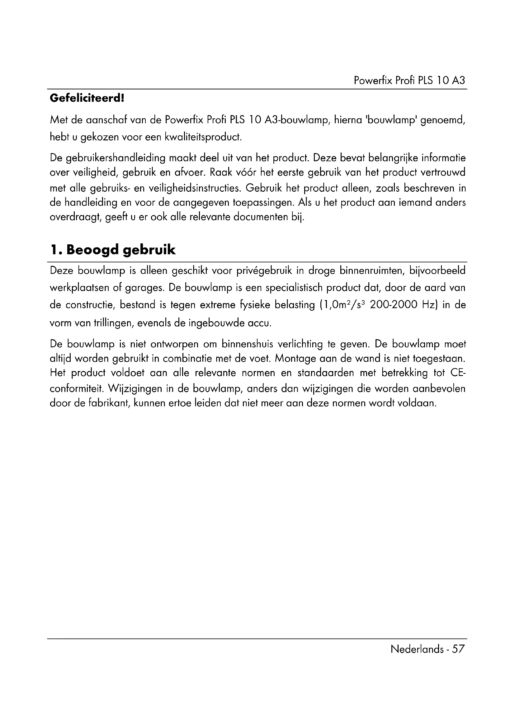 Deze bouwlamp is alleen geschikt voor privégebruik in droge binnenruimten, bijvoorbeeld werkplaatsen of garages. De bouwlamp is een specialistisch product dat, door de aard van de constructie, bestand is tegen extreme fysieke belasting (1,0m²/s³ 200-2000 Hz) in de vorm van trillingen, evenals de ingebouwde accu. De bouwlamp is niet ontworpen om binnenshuis verlichting te geven. De bouwlamp moet altijd worden gebruikt in combinatie met de voet. Montage aan de wand is niet toegestaan. Het product voldoet aan alle relevante normen en standaarden met betrekking tot CE- conformiteit. Wijzigingen in de bouwlamp, anders dan wijzigingen die worden aanbevolen door de fabrikant, kunnen ertoe leiden dat niet meer aan deze normen wordt voldaan.Powerfix Profi PLS 10 A3