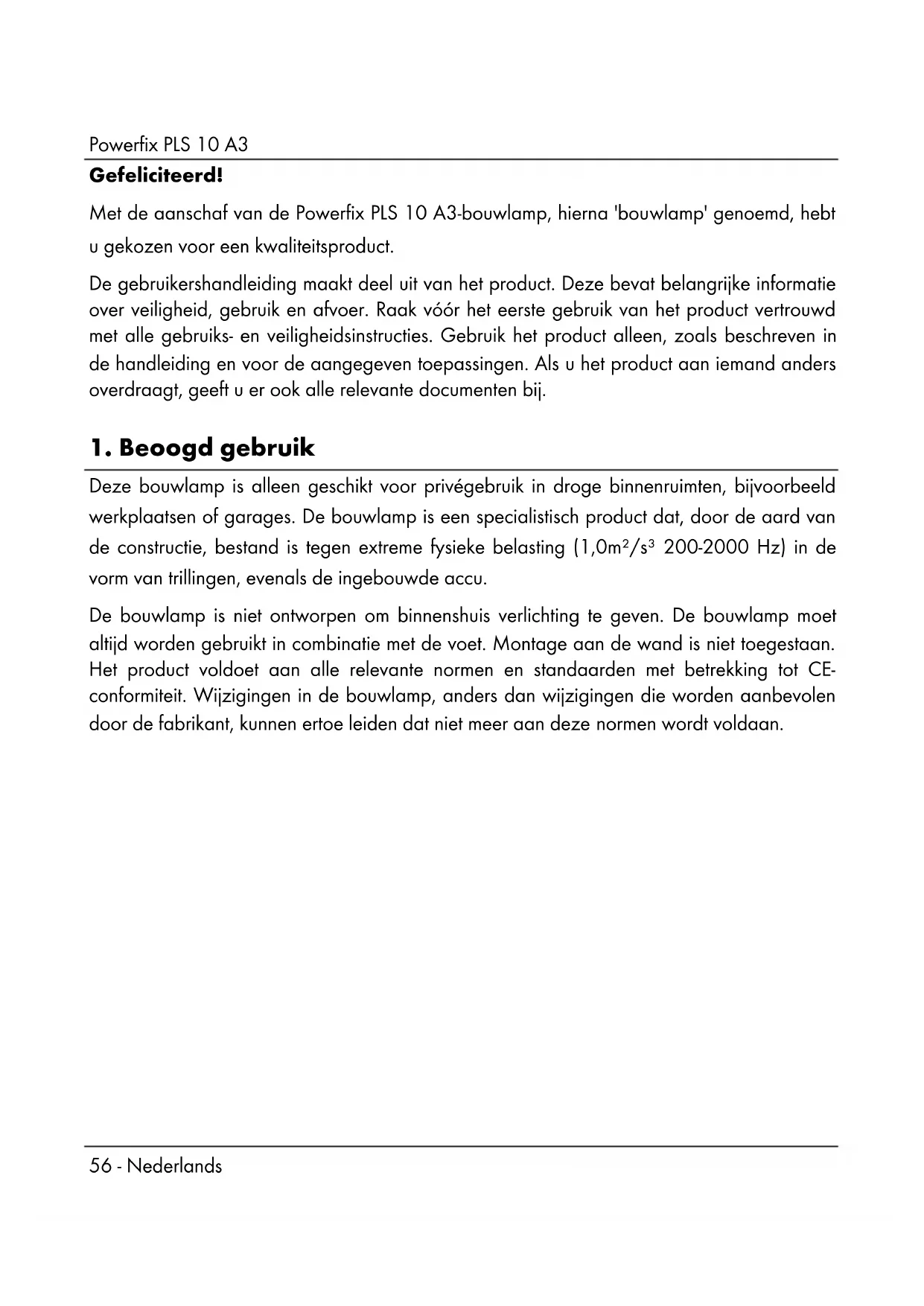 Deze bouwlamp is alleen geschikt voor privégebruik in droge binnenruimten, bijvoorbeeld werkplaatsen of garages. De bouwlamp is een specialistisch product dat, door de aard van de constructie, bestand is tegen extreme fysieke belasting (1,0m²/s³ 200-2000 Hz) in de vorm van trillingen, evenals de ingebouwde accu. De bouwlamp is niet ontworpen om binnenshuis verlichting te geven. De bouwlamp moet altijd worden gebruikt in combinatie met de voet. Montage aan de wand is niet toegestaan. Het product voldoet aan alle relevante normen en standaarden met betrekking tot CE- conformiteit. Wijzigingen in de bouwlamp, anders dan wijzigingen die worden aanbevolen door de fabrikant, kunnen ertoe leiden dat niet meer aan deze normen wordt voldaan.Powerfix PLS 10 A3 Nederlands - 57