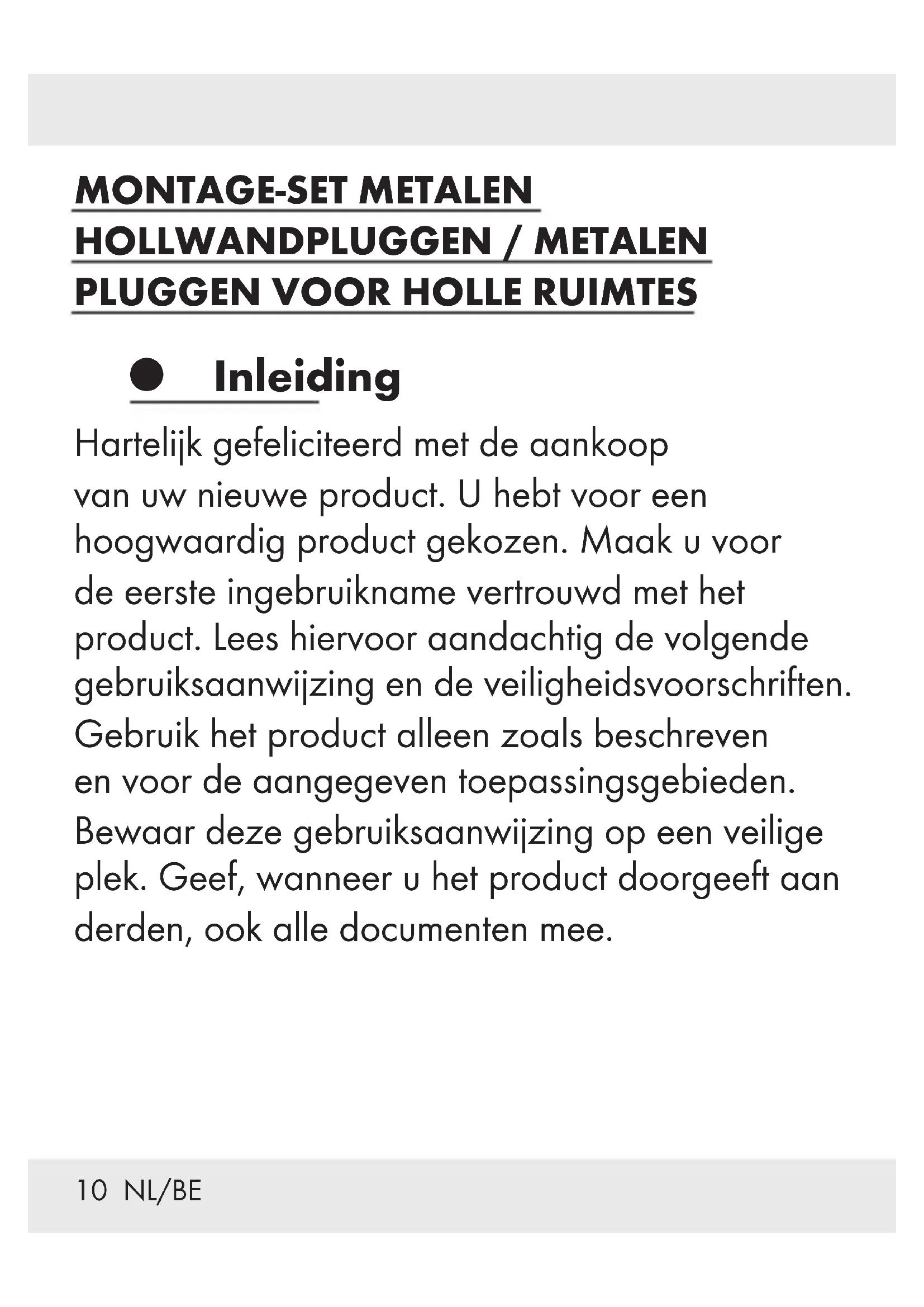 Inleiding Hartelijk gefeliciteerd met de aankoop van uw nieuwe product. U hebt voor een hoogwaardig product gekozen. Maak u voor de eerste ingebruikname vertrouwd met het product. Lees hiervoor aandachtig de volgende gebruiksaanwijzing en de veiligheidsvoorschriften. Gebruik het product alleen zoals beschreven en voor de aangegeven toepassingsgebieden. Bewaar deze gebruiksaanwijzing op een veilige plek. Geef, wanneer u het product doorgeeft aan derden, ook alle documenten mee.11NL/BE Beoogd gebruik Voor bevestigingen aan gipsplaat, gipsvezelplaat, holle plafonds en spaanplaat. Alleen voor privégebruik. Het product is niet bestemd voor commerciële toepassingen. Voor schade ontstaan door gebruik anders dan beoogd wijst de fabrikant iedere aansprakelijkheid af. Veiligheidsinstructies