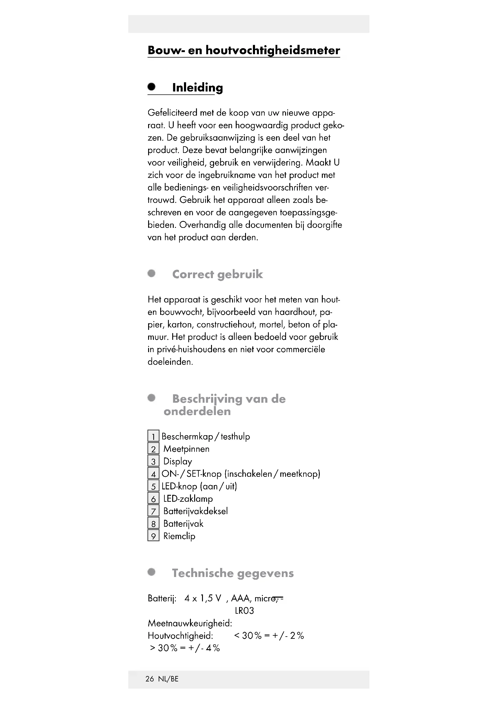 Het apparaat is geschikt voor het meten van houten bouwwocht, bijvoorbeeld van haardhout, papier, karton, constructiehout, mortel, beton of pla-muur. Het product is alleen bedoeld voor gebruik in privé-huishoudens en nicht voor commerciele doeleinden.
