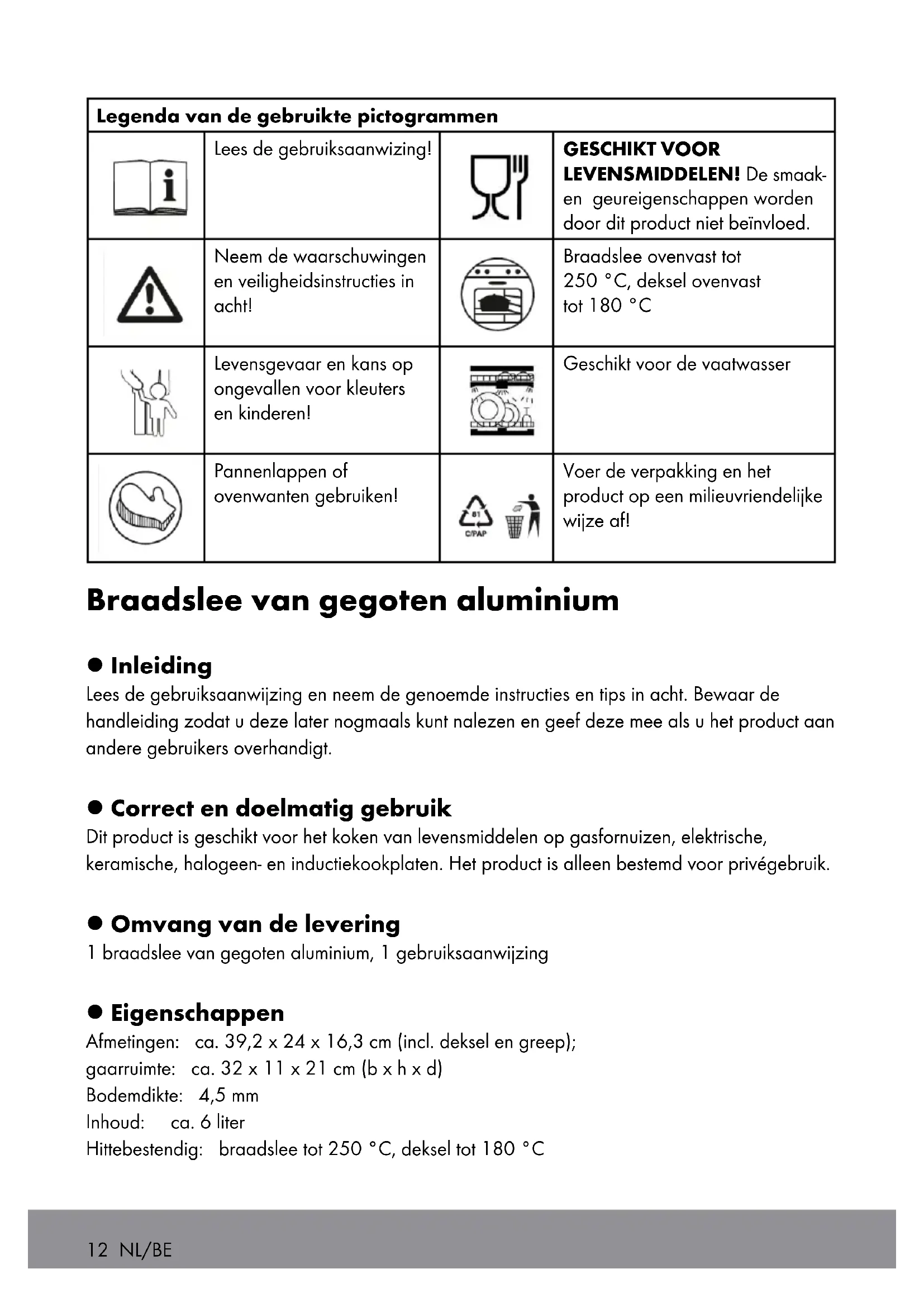 Mise au rebut L’emballage se compose de matières recyclables pouvant être mises au rebut dans les déchetteries locales. Votre mairie ou votre municipalité vous renseigneront sur les possibilités de mise au rebut des produits usagés.12 NL/BE Legenda van de gebruikte pictogrammen Lees de gebruiksaanwizing! GESCHIKT VOOR LEVENSMIDDELEN! De smaak- en geureigenschappen worden door dit product niet beïnvloed. Neem de waarschuwingen en veiligheidsinstructies in acht! Braadslee ovenvast tot 250 °C, deksel ovenvast tot 180 °C Levensgevaar en kans op ongevallen voor kleuters en kinderen! Geschikt voor de vaatwasser Pannenlappen of ovenwanten gebruiken! Voer de verpakking en het product op een milieuvriendelijke wijze af! Braadslee van gegoten aluminium l Inleiding Lees de gebruiksaanwijzing en neem de genoemde instructies en tips in acht. Bewaar de handleiding zodat u deze later nogmaals kunt nalezen en geef deze mee als u het product aan andere gebruikers overhandigt. l Correct en doelmatig gebruik Dit product is geschikt voor het koken van levensmiddelen op gasfornuizen, elektrische, keramische, halogeen- en inductiekookplaten. Het product is alleen bestemd voor privégebruik. l Omvang van de levering 1 braadslee van gegoten aluminium, 1 gebruiksaanwijzing l Eigenschappen Afmetingen: ca. 39,2 x 24 x 16,3 cm (incl. deksel en greep); gaarruimte: ca. 32 x 11 x 21 cm (b x h x d) Bodemdikte: 4,5 mm Inhoud: ca. 6 liter Hittebestendig: braadslee tot 250 °C, deksel tot 180 °CNL/BE 13 Convient aux environnements suivants : Gasfornuis Inductie Elektrisch fornuis Halogeen kookplaat Keramische kookplaat