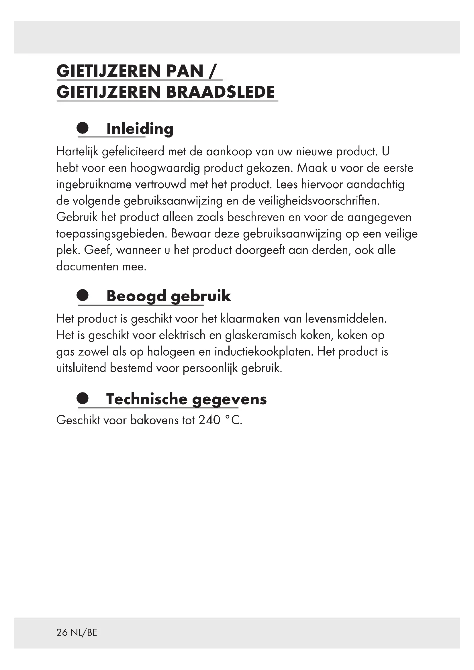 GESCHIKT VOOR LEVENSMIDDELEN! Smaak- en reukeigenschappen worden niet door dit product beïnvloed. Gebruik Kook het product vóór het eerste gebruik 2 of 3 maal met water uit om eventuele achtergebleven resten van het productieproces te verwijderen. Maak het product dan schoon met een warm sopje, spoel het vervolgens af met schoon water en droog het dan goed af. Wrijf de binnenkant van het product dan in met wat boter of een beetje olie. Verwarm het product dan een beetje. Verlaag de temperatuur zodra het vet ingetrokken is. Wacht ongeveer 2 tot 3 minuten tot het product is afgekoeld en verwijder dan het overtollige vet. Gebruik bij het koken of braden geen hoge temperaturen. Omdat het gietijzer warmte goed vasthoudt, zijn niet al te hoge temperaturen meer dan voldoende. Te hoge temperaturen kunnen anders leiden tot slechte kookresultaten of tot het aankoeken van eten zoals bijv. bij gebakken eieren. Zorg ervoor dat u het product niet te snel verhit. Het emaille kan mogelijk versplinteren als het gietijzer sneller uitzet dan het emaille.29NL/BE Tip: De lichte emaillen binnenkant is speciaal geschikt voor het langzaam klaarmaken van spijzen bij uiterst lage temperaturen of in de oven bij een gemiddelde temperatuur. Door de bobbels op de onderkant van het deksel ontstaat bij het koken een kringloop binnenin het kookgerei. De opstijgende waterdamp condenseert op het deksel en wordt door de nopjes gelijkmatig over de gaar te koken gerechten verdeeld. Daardoor zijn de gaargekookte spijzen na het koken sappig en hebben ze hun natuurlijke smaak behouden. Het emaillen oppervlak is niet geschikt voor droog koken. Gebruik altijd een beetje boter of olie en zorg ervoor dat de bodem volledig bedekt is voordat u het kookgerei gaat verwarmen. Tip voor inductiekookplaten Kies de grootte van de kookplaat zo dat deze overeenkomt met de diameter van de onderkant van het product om zo hitteverlies te voorkomen. Tip: Onder bepaalde omstandigheden kunt u een geluid horen dat een gevolg is van de elektromagnetische eigenschappen van de warmtebron en van het product. Dit is normaal en zijn niet het gevolg van een defect van uw inductieplaat of van het product. Plaats het product midden op de kookplaat. OPGELET! Product warmt snel op! Pan bij voorverwarmen niet oververhitten. Raakt de pan toch oververhit, ventileer de ruimte dan goed.30 NL/BE Reiniging en onderhoud Laat het product altijd eerst een beetje afkoelen voordat u het schoon gaat maken. Dompel het product nooit onder in koud water als het heet is. Door de plotselinge temperatuurverandering kan het emaille beschadigd worden. Vul het product evenmin met koud water. Spoel het product af met heet water en een normaal verkrijgbaar afwasmiddel. Week vastzittende voedselresten eerst een tijdje en verwijder ze dan met bijv. een houten schraper, een spons of een borstel. Gebruik nooit harde objecten, staalwol en / of agressieve dan wel schurende schoonmaakmiddelen zoals een gechloreerd bleekmiddel, omdat deze het emaille kunnen beschadigen. Droog het product na het schoonmaken goed af. Wrijf de rand van het product af en toe in met een beetje slaolie om roestsporen, die in de loop der tijd kunnen ontstaan, te voorkomen. Bewaar het product op een droge en goedgeventileerde plaats.