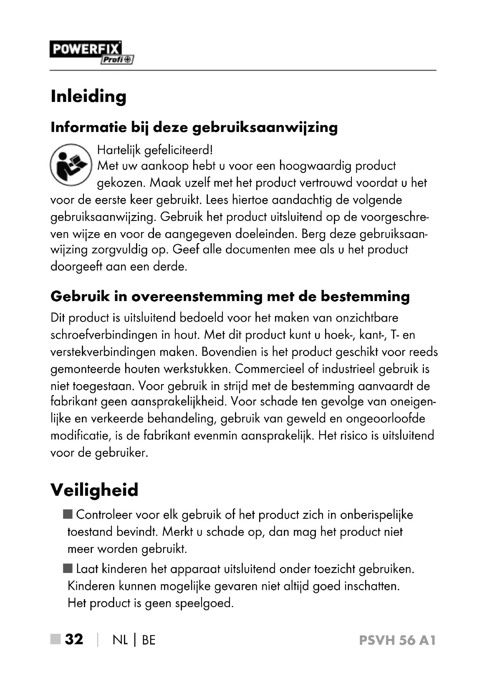 Inleiding Informatie bij deze gebruiksaanwijzing Hartelijk gefeliciteerd! Met uw aankoop hebt u voor een hoogwaardig product gekozen. Maak uzelf met het product vertrouwd voordat u het voor de eerste keer gebruikt. Lees hiertoe aandachtig de volgende gebruiksaanwijzing. Gebruik het product uitsluitend op de voorgeschre- ven wijze en voor de aangegeven doeleinden. Berg deze gebruiksaan- wijzing zorgvuldig op. Geef alle documenten mee als u het product doorgeeft aan een derde. Gebruik in overeenstemming met de bestemming Dit product is uitsluitend bedoeld voor het maken van onzichtbare schroefverbindingen in hout. Met dit product kunt u hoek-, kant-, T- en verstekverbindingen maken. Bovendien is het product geschikt voor reeds gemonteerde houten werkstukken. Commercieel of industrieel gebruik is niet toegestaan. Voor gebruik in strijd met de bestemming aanvaardt de fabrikant geen aansprakelijkheid. Voor schade ten gevolge van oneigen- lijke en verkeerde behandeling, gebruik van geweld en ongeoorloofde modificatie, is de fabrikant evenmin aansprakelijk. Het risico is uitsluitend voor de gebruiker. Veiligheid ■ Controleer voor elk gebruik of het product zich in onberispelijke toestand bevindt. Merkt u schade op, dan mag het product niet meer worden gebruikt. ■ Laat kinderen het apparaat uitsluitend onder toezicht gebruiken. Kinderen kunnen mogelijke gevaren niet altijd goed inschatten. Het product is geen speelgoed.PSVH 56 A1