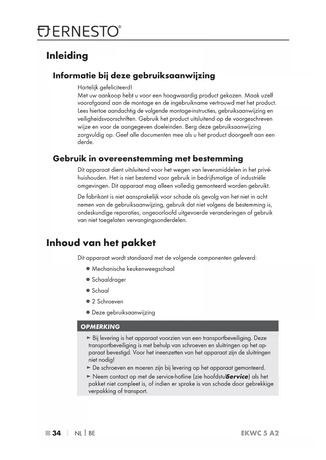 Inleiding Informatie bij deze gebruiksaanwijzing Hartelijk gefeliciteerd! Met uw aankoop hebt u voor een hoogwaardig product gekozen. Maak uzelf voorafgaand aan de montage en de ingebruikname vertrouwd met het product. Lees hiertoe aandachtig de volgende montage-instructies, gebruiksaanwijzing en veiligheidsvoorschriften. Gebruik het product uitsluitend op de voorgeschreven wijze en voor de aangegeven doeleinden. Berg deze gebruiksaanwijzing zorgvuldig op. Geef alle documenten mee als u het product doorgeeft aan een derde. Gebruik in overeenstemming met bestemming Dit apparaat dient uitsluitend voor het wegen van levensmiddelen in het privé- huishouden. Het is niet bestemd voor gebruik in bedrijfsmatige of industriële omgevingen. Dit apparaat mag alleen volledig gemonteerd worden gebruikt. De fabrikant is niet aansprakelijk voor schade als gevolg van het niet in acht nemen van de gebruiksaanwijzing, gebruik dat niet volgens de bestemming is, ondeskundige reparaties, ongeoorloofd uitgevoerde veranderingen of gebruik van niet toegelaten vervangingsonderdelen. Inhoud van het pakket Dit apparaat wordt standaard met de volgende componenten geleverd: ▯ Mechanische keukenweegschaal ▯ Schaaldrager ▯ Schaal ▯ 2 Schroeven ▯ Deze gebruiksaanwijzing OPMERKING ► Bij levering is het apparaat voorzien van een transportbeveiliging. Deze transportbeveiliging is met behulp van schroeven en sluitringen op het ap- paraat bevestigd. Voor het ineenzetten van het apparaat zijn de sluitringen niet nodig! ► De schroeven en moeren zijn bij levering op het apparaat gemonteerd. ► Neem contact op met de service-hotline (zie hoofdstuk Service ) als het pakket niet compleet is, of indien er sprake is van schade door gebrekkige verpakking of transport. IB_339189_EKWC5A2_LB8.indb 34 27.02.20 11:28EKWC 5 A2