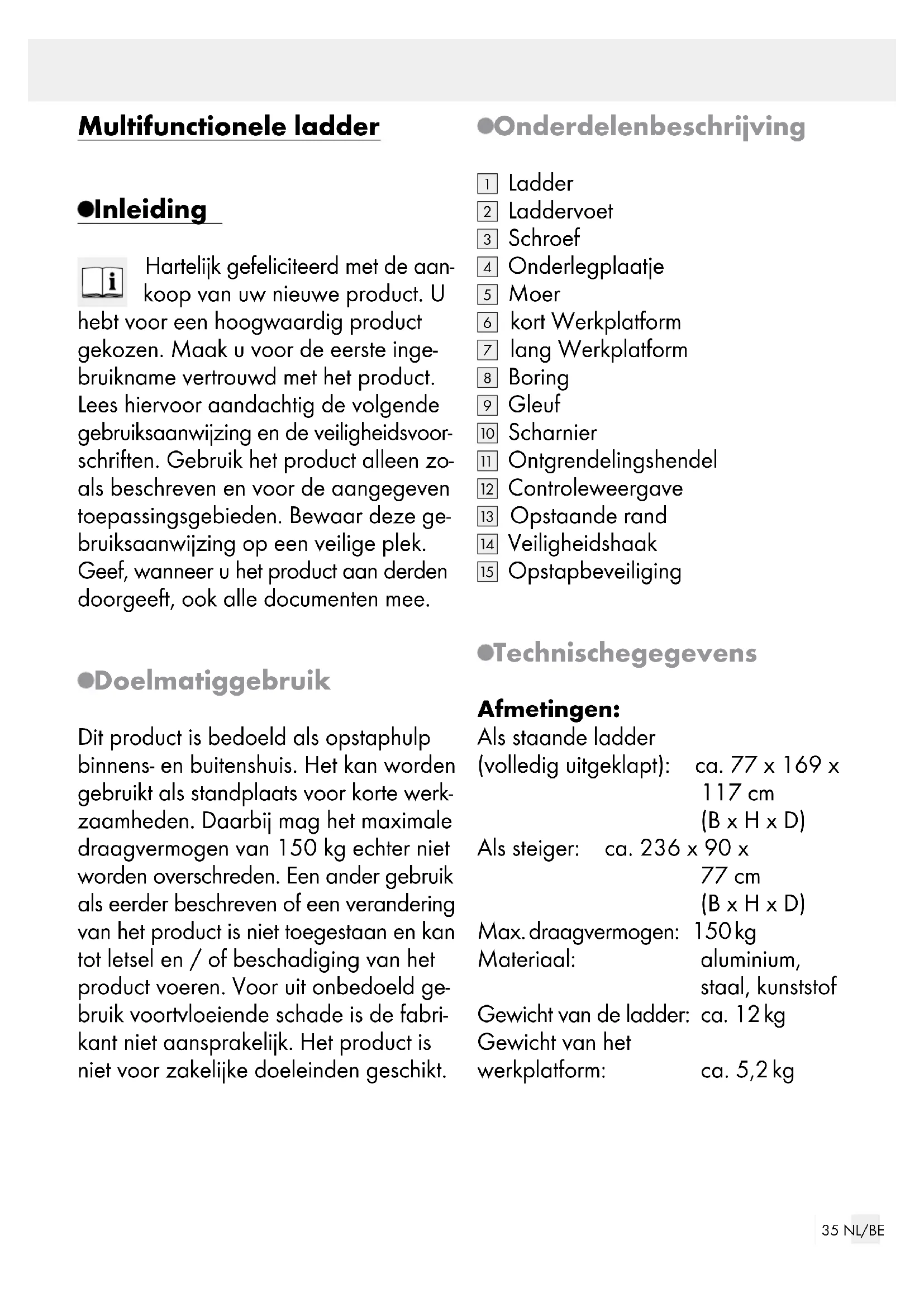 Opstapbeveiliging Technische gegevens Afmetingen: Als staande ladder (volledig uitgeklapt): ca. 77 x 169 x 117 cm (B x H x D) Als steiger: ca. 236 x 90 x 77 cm (B x H x D) Max. draagvermogen: 150 kg Materiaal: aluminium, staal, kunststof Gewicht van de ladder: ca. 12 kg Gewicht van het werkplatform: ca. 5,2 kg36 NL/BE Leveringsomvang 1 multifunctionele ladder 2 laddervoeten 4 schroeven 4 onderlegplaatjes 4 moeren 2 werkplatforms 1 gebruiksaanwijzing Veiligheidsinstructies Algemene veiligheidsinstructies LEVENSGEVAAR EN