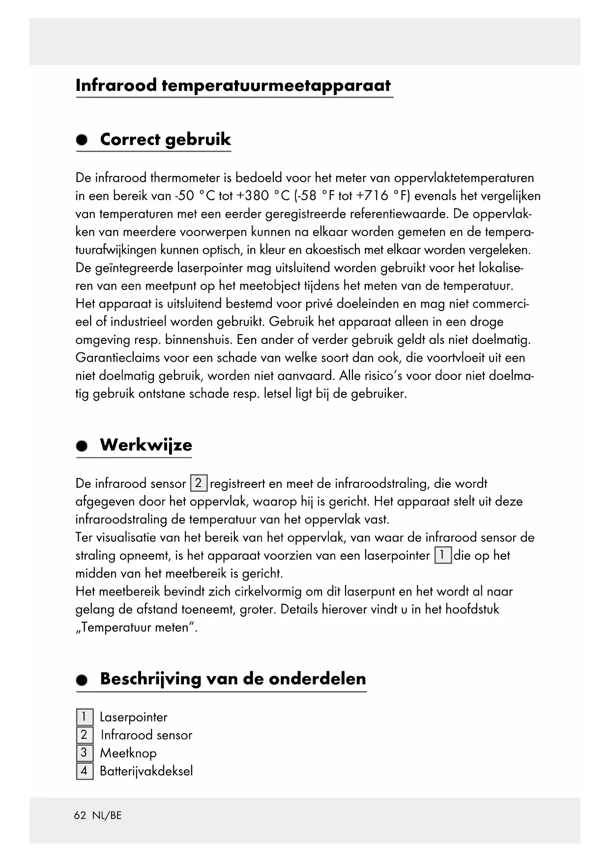 registreert en meet de infraroodstraling, die wordt afgegeven door het oppervlak, waarop hij is gericht. Het apparaat stelt uit deze infraroodstraling de temperatuur van het oppervlak vast. Ter visualisatie van het bereik van het oppervlak, van waar de infrarood sensor de straling opneemt, is het apparaat voorzien van een laserpointer