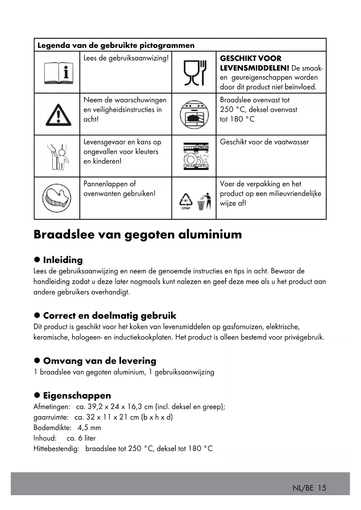 Mise au rebut L’emballage se compose de matières recyclables pouvant être mises au rebut dans les déchetteries locales. Votre mairie ou votre municipalité vous renseigneront sur les possibilités de mise au rebut des produits usagés.NL/BE 15 Legenda van de gebruikte pictogrammen Lees de gebruiksaanwizing! GESCHIKT VOOR LEVENSMIDDELEN! De smaak- en geureigenschappen worden door dit product niet beïnvloed. Neem de waarschuwingen en veiligheidsinstructies in acht! Braadslee ovenvast tot 250 °C, deksel ovenvast tot 180 °C Levensgevaar en kans op ongevallen voor kleuters en kinderen! Geschikt voor de vaatwasser Pannenlappen of ovenwanten gebruiken! Voer de verpakking en het product op een milieuvriendelijke wijze af! Braadslee van gegoten aluminium l Inleiding Lees de gebruiksaanwijzing en neem de genoemde instructies en tips in acht. Bewaar de handleiding zodat u deze later nogmaals kunt nalezen en geef deze mee als u het product aan andere gebruikers overhandigt. l Correct en doelmatig gebruik Dit product is geschikt voor het koken van levensmiddelen op gasfornuizen, elektrische, keramische, halogeen- en inductiekookplaten. Het product is alleen bestemd voor privégebruik. l Omvang van de levering 1 braadslee van gegoten aluminium, 1 gebruiksaanwijzing l Eigenschappen Afmetingen: ca. 39,2 x 24 x 16,3 cm (incl. deksel en greep); gaarruimte: ca. 32 x 11 x 21 cm (b x h x d) Bodemdikte: 4,5 mm Inhoud: ca. 6 liter Hittebestendig: braadslee tot 250 °C, deksel tot 180 °C16 NL/BE Convient aux environnements suivants : Gasfornuis Inductie Elektrisch fornuis Halogeen kookplaat Keramische kookplaat