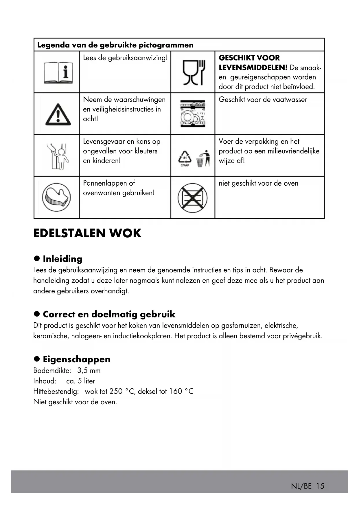 Service Gurris GmbH Gaußstr. 10 68165 Mannheim ALLEMAGNE IAN 347452_2001Legenda van de gebruikte pictogrammen Lees de gebruiksaanwizing! GESCHIKT VOOR LEVENSMIDDELEN! De smaak- en geureigenschappen worden door dit product niet beïnvloed. Neem de waarschuwingen en veiligheidsinstructies in acht! Geschikt voor de vaatwasser Levensgevaar en kans op ongevallen voor kleuters en kinderen! Voer de verpakking en het product op een milieuvriendelijke wijze af! Pannenlappen of ovenwanten gebruiken! niet geschikt voor de oven EDELSTALEN WOK l Inleiding Lees de gebruiksaanwijzing en neem de genoemde instructies en tips in acht. Bewaar de handleiding zodat u deze later nogmaals kunt nalezen en geef deze mee als u het product aan andere gebruikers overhandigt. l Correct en doelmatig gebruik Dit product is geschikt voor het koken van levensmiddelen op gasfornuizen, elektrische, keramische, halogeen- en inductiekookplaten. Het product is alleen bestemd voor privégebruik. l Eigenschappen Bodemdikte: 3,5 mm Inhoud: ca. 5 liter Hittebestendig: wok tot 250 °C, deksel tot 160 °C Niet geschikt voor de oven. NL/BE 15l Veiligheidsinstructies n WAARSCHUWING! LEVENSGEVAAR EN KANS OP ONGEVALLEN VOOR KLEUTERS EN KINDEREN! Laat kinderen nooit zonder toezicht bij het verpakkingsmateriaal. Er bestaat verstikkingsgevaar. Houd kinderen uit de buurt van het product. n WAARSCHUWING! Laat kinderen nooit zonder toezicht in de buurt van heet kookgerei. n VEILIGHEIDSHANDSCHOENEN DRAGEN! Het product wordt zeer heet tijdens het koken. Gebruik daarom pannenlappen of ovenwanten ter bescherming. n Voorzichtig bij hete olie of vet! Het product niet met hete olie of vet door de keuken dragen. n Bij het koken is het van het grootste belang dat u het product waar vet in wordt verhit, in het oog houdt. Vet kan snel oververhit raken en ontbranden. Als vet eenmaal brandt, moet het in geen geval met water worden geblust. Door op de gloeiende fornuisplaat spattend vet kan snel een brand ontstaan. n Brandend vet niet met water blussen, maar de vlammen doven met een (blus-)deken of een brandblusser. n Schrik het product niet af met koud water. n Verhit het product niet als er niets in zit. n Het product niet over een keramische kookplaat schuiven of trekken. n Kras of snijd niet in het product. Gebruik hulpmiddelen van hout of kunststof. n Verhit het product op een gemiddelde temperatuur. n Verhit het product niet te sterk. Bij eventuele oververhitting moet het vertrek goed worden geventileerd. n Hoge temperaturen kunnen tot verkleuringen aan de buitenkant van het product leiden. Dit is geen materiaalfout en heeft geen invloed op de kwaliteit of de werking van het product. 16 NL/BE Convient aux environnements suivants : Gasfornuis Inductie Elektrisch fornuis Halogeen kookplaat Keramische kookplaatn GESCHIKT VOOR LEVENSMIDDELEN! De smaak- en geureigenschappen worden door dit product niet beïnvloed. n Voor een optimaal energiegebruik dient de grootte van de kookplaat overeen te komen met de bodem van het product en moet het product in het midden van de kookplaat worden gezet. Plaats het product alleen met een droge bodem op de kookplaat.