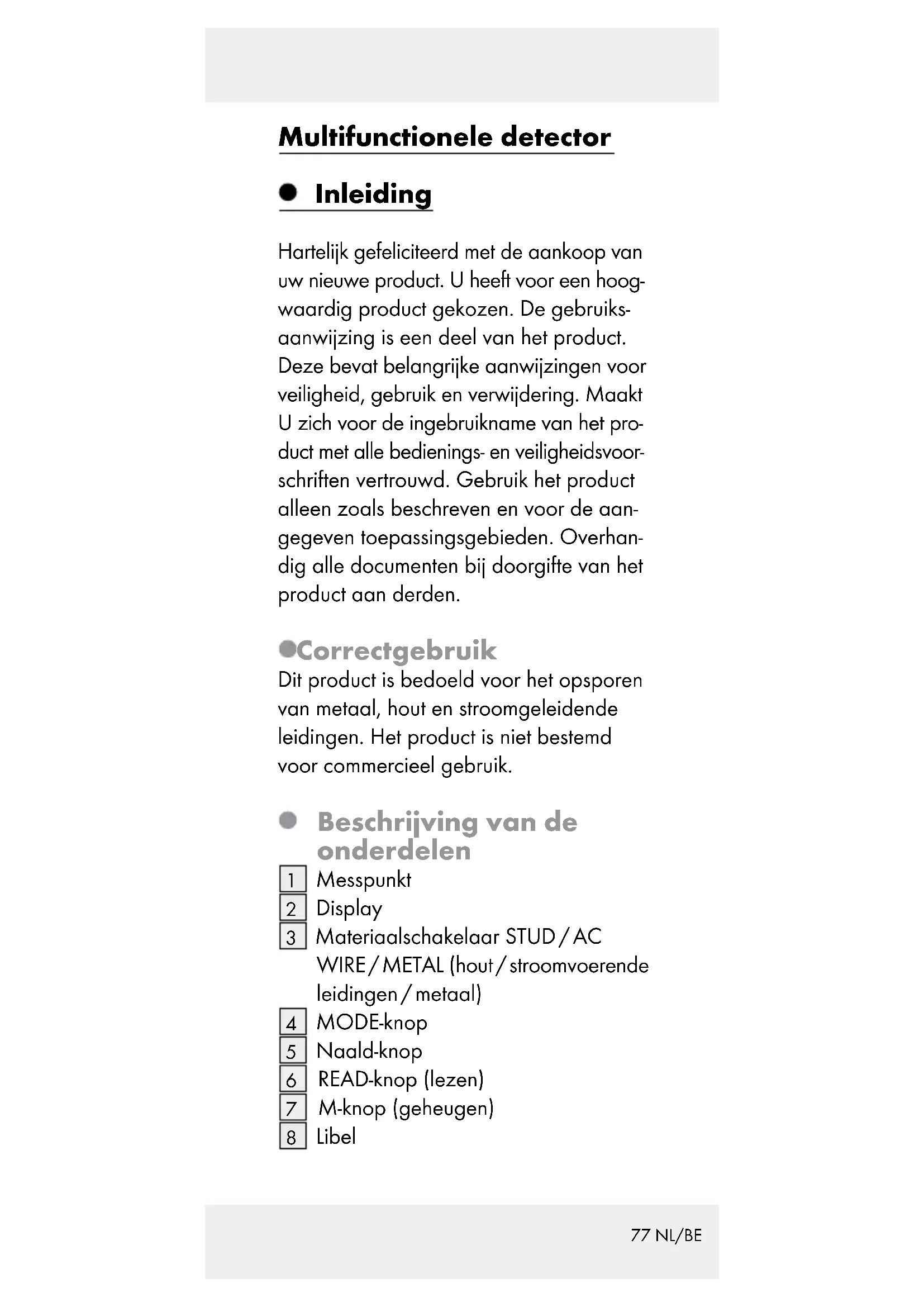 uw nieuwe product. U heeft voor een hoog- waardig product gekozen. De gebruiks- aanwijzing is een deel van het product. Deze bevat belangrijke aanwijzingen voor veiligheid, gebruik en verwijdering. Maakt U zich voor de ingebruikname van het pro- duct met alle bedienings- en veiligheidsvoor- schriften vertrouwd. Gebruik het product alleen zoals beschreven en voor de aan- gegeven toepassingsgebieden. Overhan- dig alle documenten bij doorgifte van het product aan derden. Correct gebruik Dit product is bedoeld voor het opsporen van metaal, hout en stroomgeleidende leidingen. Het product is niet bestemd voor commercieel gebruik. Beschrijving van de onderdelen