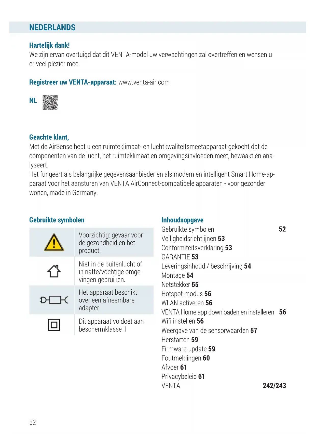 Gebruikte symbolen Hartelijk dank! We zijn ervan overtuigd dat dit VENTA-model uw verwachtingen zal overtreffen en wensen u er veel plezier mee. Registreer uw VENTA-apparaat: www.venta-air.com Geachte klant, Met de AirSense hebt u een ruimteklimaat- en luchtkwaliteitsmeetapparaat gekocht dat de componenten van de lucht, het ruimteklimaat en omgevingsinvloeden meet, bewaakt en ana- lyseert. Het fungeert als belangrijke gegevensaanbieder en als modern en intelligent Smart Home-ap- paraat voor het aansturen van VENTA AirConnect-compatibele apparaten - voor gezonder wonen, made in Germany. Voorzichtig: gevaar voor de gezondheid en het product. Niet in de buitenlucht of in natte/vochtige omge- vingen gebruiken. Het apparaat beschikt over een afneembare adapter Dit apparaat voldoet aan beschermklasse II Inhoudsopgave Gebruikte symbolen