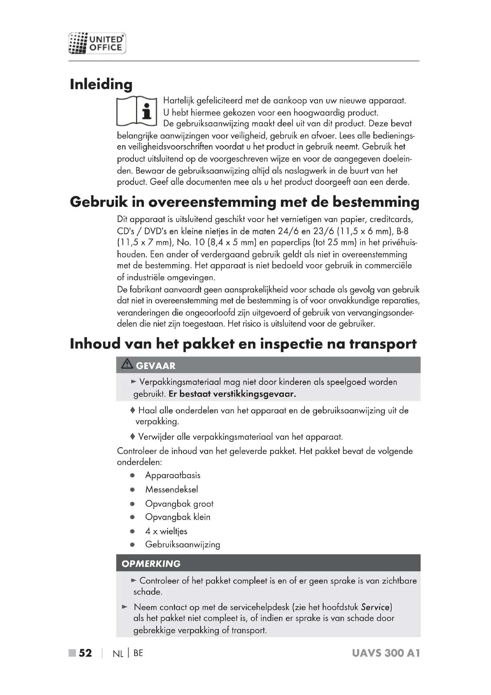 UAVS 300 A1 Inleiding Hartelijk gefeliciteerd met de aankoop van uw nieuwe apparaat. U hebt hiermee gekozen voor een hoogwaardig product. De gebruiksaanwijzing maakt deel uit van dit product. Deze bevat belangrijke aanwijzingen voor veiligheid, gebruik en afvoer. Lees alle bedienings- en veiligheidsvoorschriften voordat u het product in gebruik neemt. Gebruik het product uitsluitend op de voorgeschreven wijze en voor de aangegeven doelein- den. Bewaar de gebruiksaanwijzing altijd als naslagwerk in de buurt van het product. Geef alle documenten mee als u het product doorgeeft aan een derde. Gebruik in overeenstemming met de bestemming Dit apparaat is uitsluitend geschikt voor het vernietigen van papier, creditcards, CD's / DVD's en kleine nietjes in de maten 24/6 en 23/6 (11,5 x 6 mm), B-8 (11,5 x 7 mm), No. 10 (8,4 x 5 mm) en paperclips (tot 25 mm) in het privéhuis- houden. Een ander of verdergaand gebruik geldt als niet in overeenstemming met de bestemming. Het apparaat is niet bedoeld voor gebruik in commerciële of industriële omgevingen. De fabrikant aanvaardt geen aansprakelijkheid voor schade als gevolg van gebruik dat niet in overeenstemming met de bestemming is of voor onvakkundige reparaties, veranderingen die ongeoorloofd zijn uitgevoerd of gebruik van vervangingsonder- delen die niet zijn toegestaan. Het risico is uitsluitend voor de gebruiker. Inhoud van het pakket en inspectie na transport GEVAAR ► Verpakkingsmateriaal mag niet door kinderen als speelgoed worden gebruikt. Er bestaat verstikkingsgevaar. ♦ Haal alle onderdelen van het apparaat en de gebruiksaanwijzing uit de verpakking. ♦ Verwijder alle verpakkingsmateriaal van het apparaat. Controleer de inhoud van het geleverde pakket. Het pakket bevat de volgende onderdelen: Ɣ Apparaatbasis Ɣ Messendeksel Ɣ Opvangbak groot Ɣ Opvangbak klein Ɣ 4 x wieltjes Ɣ Gebruiksaanwijzing OPMERKING ► Controleer of het pakket compleet is en of er geen sprake is van zichtbare schade. ► Neem contact op met de servicehelpdesk (zie het hoofdstuk Service) als het pakket niet compleet is, of indien er sprake is van schade door gebrekkige verpakking of transport.NL