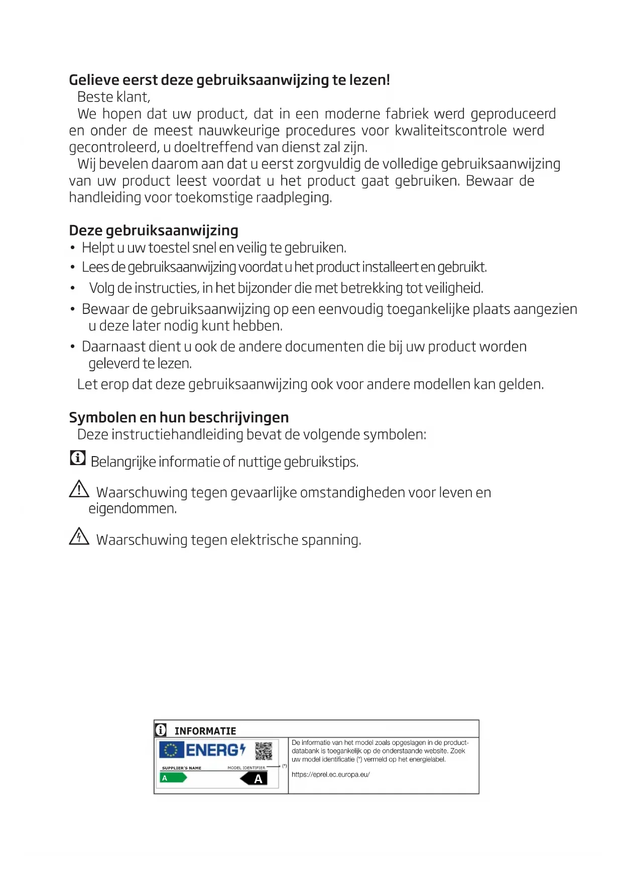 - Daarnaast dient u ook de andere documenten die bij uw product worden geleverd te lezen. Let erop dat deze gebruiksaanwijzing ook voor andere modellen kan gelden. Symbolen en hun beschrijvingen Deze instructiehandleiding bevat de volgende symbolen: C Belangrijke informatie of nuttige gebruikstips. A Waarschuwing tegen gevaarlijke omstandigheden voor leven en eigendommen. B Waarschuwing tegen elektrische spanning. INFORMATIE