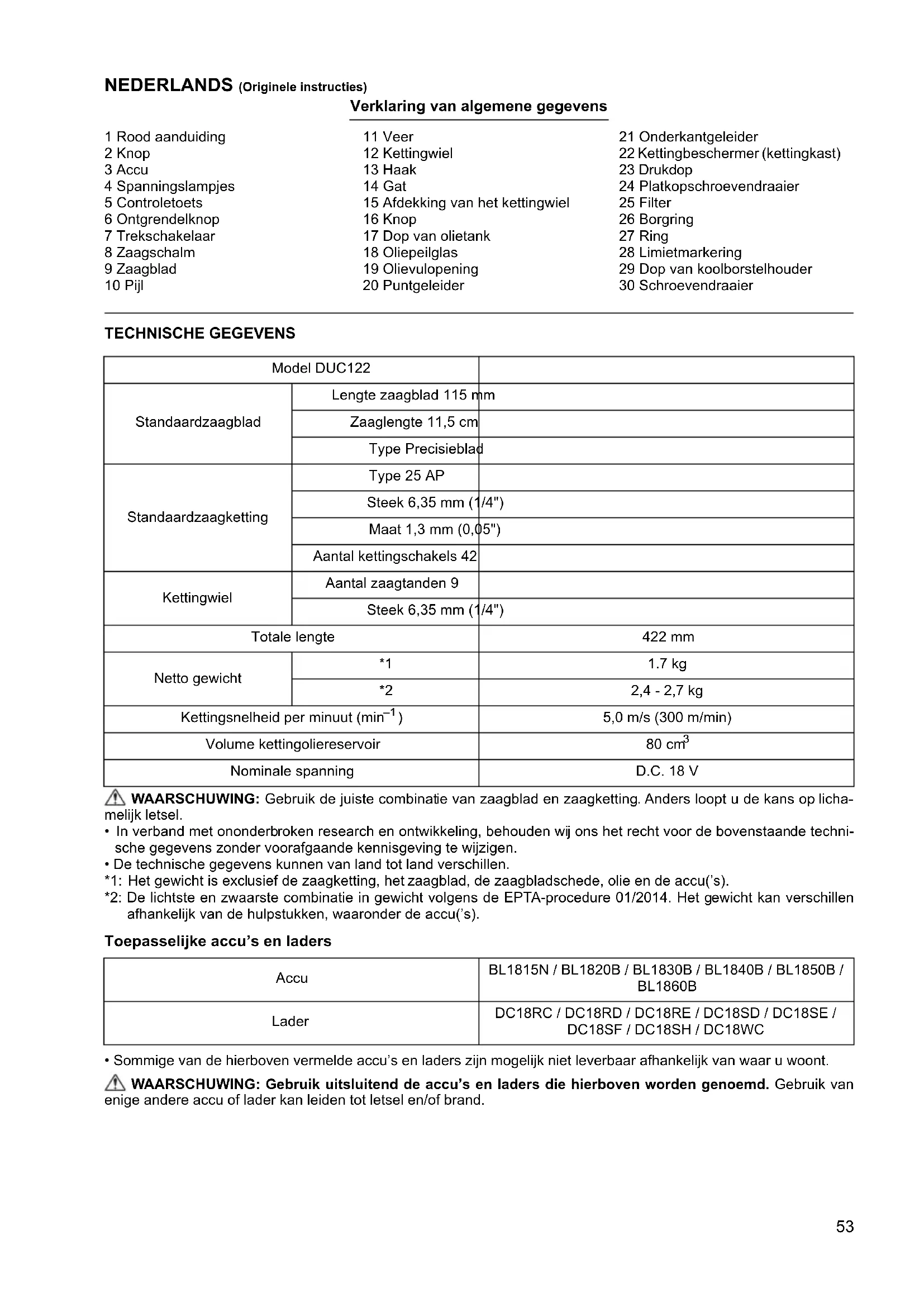 Solo per i paesi europei Le Dichiarazioni di conformità sono incluse nell’Allegato A al presente manuale d’uso.53 NEDERLANDS (Originele instructies) Verklaring van algemene gegevens 1 Rood aanduiding 2 Knop 3 Accu 4 Spanningslampjes 5 Controletoets 6 Ontgrendelknop 7 Trekschakelaar 8 Zaagschalm 9 Zaagblad 10 Pijl 11 Veer 12 Kettingwiel 13 Haak 14 Gat 15 Afdekking van het kettingwiel 16 Knop 17 Dop van olietank 18 Oliepeilglas 19 Olievulopening 20 Puntgeleider 21 Onderkantgeleider 22 Kettingbeschermer (kettingkast) 23 Drukdop 24 Platkopschroevendraaier 25 Filter 26 Borgring 27 Ring 28 Limietmarkering 29 Dop van koolborstelhouder 30 Schroevendraaier TECHNISCHE GEGEVENS WAARSCHUWING: Gebruik de juiste combinatie van zaagblad en zaagketting. Anders loopt u de kans op licha- melijk letsel.