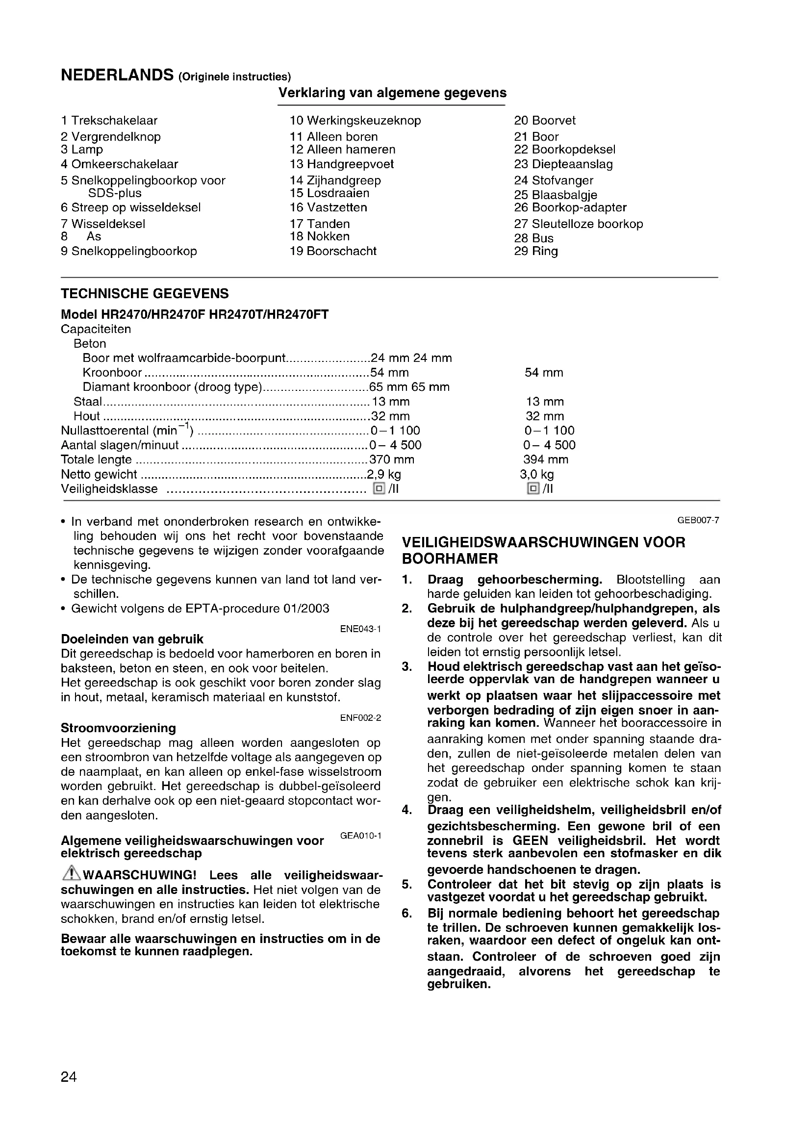 - Gewicht volgens de EPTA-procedure 01/2003 ENE043-1 Doeleinden van gebruik Dit gereedschap is bedoeld voor hamerboren en boren in baksteen, beton en steen, en ook voor beitelen. Het gereedschap is ook geschikt voor boren zonder slag in hout, metaal, keramisch materiaal en kunststof. ENF002-2 Stroomvoorziening Het gereedschap mag alleen worden aangesloten op een stroombron van hetzelfde voltage als aangegeven op de naamplaat, en kan alleen op enkel-fase wisselstroom worden gebruikt. Het gereedschap is dubbel-geïsoleerd en kan derhalve ook op een niet-geaard stopcontact wor- den aangesloten. GEA010-1 Algemene veiligheidswaarschuwingen voor elektrisch gereedschap WAARSCHUWING! Lees alle veiligheidswaar- schuwingen en alle instructies. Het niet volgen van de waarschuwingen en instructies kan leiden tot elektrische schokken, brand en/of ernstig letsel. Bewaar alle waarschuwingen en instructies om in de toekomst te kunnen raadplegen. GEB007-7 VEILIGHEIDSWAARSCHUWINGEN VOOR BOORHAMER