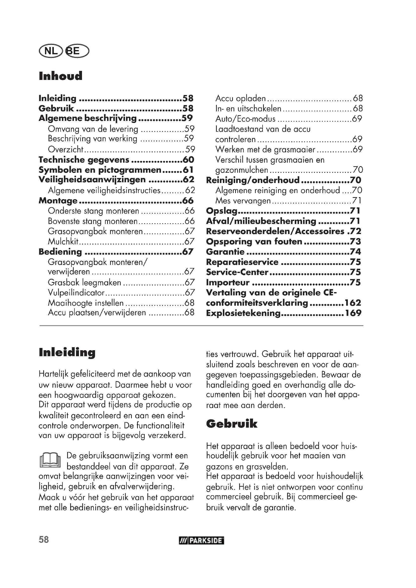 - Importeur ties vertrouwd. Gebruik het apparaat uit- sluitend zoals beschreven en voor de aan- gegeven toepassingsgebieden. Bewaar de handleiding goed en overhandig alle do- cumenten b het doorgeven van het appa- raat mee aan derden. Gebruik Het apparaat is alleen bedoeld voor huis- houdelk gebruik voor het maaien van gazons en grasvelden. Het apparaat is bedoeld voor huishoudelk gebruik. Het is niet ontworpen voor continu commercieel gebruik. B commercieel ge- bruik vervalt de garantie.59 NL BE Elk ander gebruik dat in deze handleiding niet expliciet wordt toegestaan, kan leiden tot schade aan het apparaat en kan een ernstig risico voor de gebruiker inhouden. Het apparaat is bedoeld voor gebruik door volwassenen. Dit apparaat mag niet worden gebruikt door kinderen of door personen die niet met de gebruiksaanw- zing vertrouwd zn. Het is verboden het apparaat te gebruiken b regen of in een vochtige omgeving. De fabrikant is niet aansprakelk voor schade die voortvloeit uit oneigenlk ge- bruik of uit een foute bediening. Het apparaat maakt deel uit van de reeks Parkside X20VTEAM en kan met accu‘s van de reeks Parkside X20VTEAM wor- den gebruikt. De accu‘s mogen alleen met originele laders van de serie Parkside X20VTEAM worden geladen. Algemene beschrving De afbeeldingen vindt u op de voorste en achterste uitklapbare bladzde. Omvang van de levering Neem het apparaat voorzichtig uit de ver- pakking en kk na, of de hierna volgende onderdelen volledig zn: - Accu-grasmaaier en bovenste stang - Onderste stang - Grasopvangbak - Handgreep-grasopvangbak - 2 kabelklemmen - 2 spanhendels met dichtingsringen en schroeven voor bevestiging van de bovenste stang - Mulchkit - Vertaling van de originele gebruiksaan- wzing Batter en lader zn niet inbegre- pen. Zorg voor een reglementair voorgeschre- ven afvalverwdering van het verpakkings- materiaal. Beschrving van werking De accu-grasmaaier is voorzien van een sngereedschap dat parallel met de maai- hoogte roteert. H is uitgerust met een krachtige elektrische motor, een robuuste kunststoffen behuizing, een veiligheids- schakelaar, een stootbeveiliging en een grasopvangbak. Het apparaat is ook 7-traps in de hoogte verstelbaar en heeft soepel lopende wielen. De functie van de verschillende bedieningsonderdelen is hieronder beschreven. Overzicht 1 Bovenste stang 2 Spanhendel voor het bevesti- gen van de bovenste stang 3 Onderste stang 4 Stootbeveiliging 5 Spanhendel voor het bevesti- gen van de onderste stang 6 Draaggreep 7 Hendel voor maaihoogteverstel- ling 8 Afdekking 9 Accu's 9a Ontgrendelknop aan de accu 10 Contactsleutel 11 Wielen 12 Behuizing van het apparaat 13 Grasopvangbak 14 Kabelklem 15 Netsnoer 16 Ontgrendelknop 17 Starthendel60 NL BE 18 Mulchkit 18a Beugel op mulchkit 19 Dubbele lader 2a Sluitringen 2b Schroeven 13a Kunststoffen lipje 13b Stangen van grasopvangbak 13c Handgreep 13d Hulphandgreep 20 Auto/Eco-schakelaar 21 Knop voor laadindicator 22 Accu-laadindicator 23 Mes 24 Mesbout 25 Motoras 26 Vulpeilindicator Technische gegevens Accu-grasmaaier p. 75