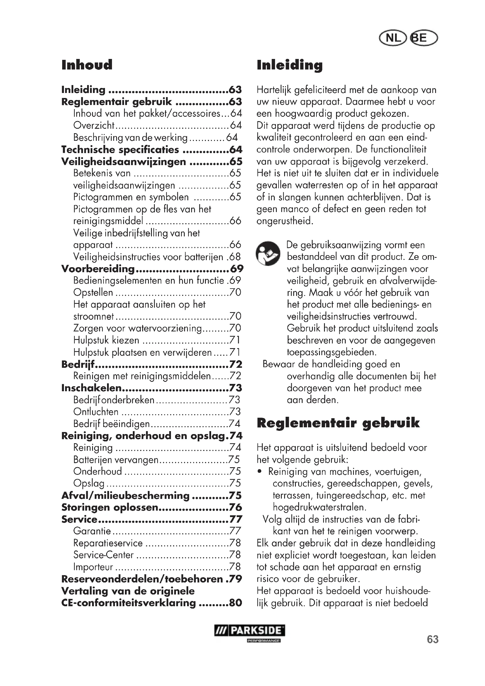 - Reiniging van machines, voertuigen, constructies, gereedschappen, gevels, terrassen, tuingereedschap, etc. met hogedrukwaterstralen. Volg altd de instructies van de fabri- kant van het te reinigen voorwerp. Elk ander gebruik dat in deze handleiding niet expliciet wordt toegestaan, kan leiden tot schade aan het apparaat en ernstig risico voor de gebruiker. Het apparaat is bedoeld voor huishoude- lk gebruik. Dit apparaat is niet bedoeld Inhoud Inleiding ....................................63 Reglementair gebruik ................63 Inhoud van het pakket/accessoires ... 64 Overzicht ...................................... 64 Beschrving van de werking ............ 64 Technischespecicaties ..............64 Veiligheidsaanwzingen ............65 Betekenis van ................................65 veiligheidsaanwzingen .................65 Pictogrammen en symbolen ............65 Pictogrammen op de es van het reinigingsmiddel ............................66 Veilige inbedrfstelling van het apparaat ......................................66 Veiligheidsinstructies voor batteren .68 Voorbereiding ............................ 69 Bedieningselementen en hun functie .69 Opstellen ......................................70 Het apparaat aansluiten op het stroomnet ......................................70 Zorgen voor watervoorziening .........70 Hulpstuk kiezen .............................71 Hulpstuk plaatsen en verwderen ..... 71 Bedrf ........................................ 72 Reinigen met reinigingsmiddelen ......72 Inschakelen................................73 Bedrf onderbreken ........................ 73 Ontluchten ....................................73 Bedrf beëindigen ..........................74 Reiniging, onderhoud en opslag . 74 Reiniging ......................................74 Batteren vervangen .......................75 Onderhoud ...................................75 Opslag .........................................75 Afval/milieubescherming ...........75 Storingen oplossen.....................76 Service ....................................... 77 Garantie .......................................77 Reparatieservice ............................78 Service-Center ...............................78 Importeur ......................................78 Reserveonderdelen/toebehoren .79 Vertaling van de originele CE-conformiteitsverklaring .........80NL BE