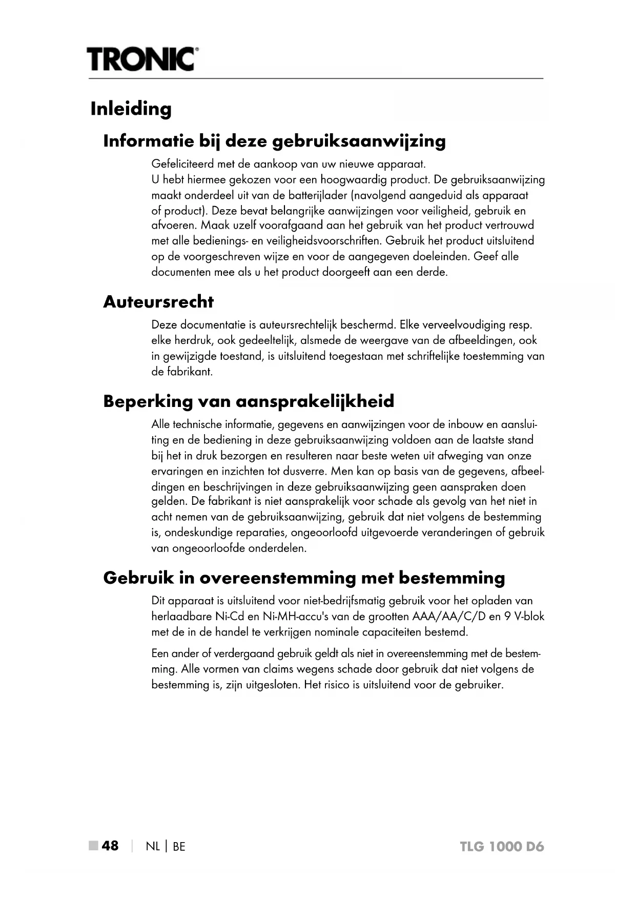 TLG 1000 D6 Inleiding Informatie bij deze gebruiksaanwijzing Gefeliciteerd met de aankoop van uw nieuwe apparaat. U hebt hiermee gekozen voor een hoogwaardig product. De gebruiksaanwijzing maakt onderdeel uit van de batterijlader (navolgend aangeduid als apparaat of product). Deze bevat belangrijke aanwijzingen voor veiligheid, gebruik en afvoeren. Maak uzelf voorafgaand aan het gebruik van het product vertrouwd met alle bedienings- en veiligheidsvoorschriften. Gebruik het product uitsluitend op de voorgeschreven wijze en voor de aangegeven doeleinden. Geef alle documenten mee als u het product doorgeeft aan een derde. Auteursrecht Deze documentatie is auteursrechtelijk beschermd. Elke verveelvoudiging resp. elke herdruk, ook gedeeltelijk, alsmede de weergave van de afbeeldingen, ook in gewijzigde toestand, is uitsluitend toegestaan met schriftelijke toestemming van de fabrikant. Beperking van aansprakelijkheid Alle technische informatie, gegevens en aanwijzingen voor de inbouw en aanslui- ting en de bediening in deze gebruiksaanwijzing voldoen aan de laatste stand bij het in druk bezorgen en resulteren naar beste weten uit afweging van onze ervaringen en inzichten tot dusverre. Men kan op basis van de gegevens, afbeel- dingen en beschrijvingen in deze gebruiksaanwijzing geen aanspraken doen gelden. De fabrikant is niet aansprakelijk voor schade als gevolg van het niet in acht nemen van de gebruiksaanwijzing, gebruik dat niet volgens de bestemming is, ondeskundige reparaties, ongeoorloofd uitgevoerde veranderingen of gebruik van ongeoorloofde onderdelen. Gebruik in overeenstemming met bestemming Dit apparaat is uitsluitend voor niet-bedrijfsmatig gebruik voor het opladen van herlaadbare Ni-Cd en Ni-MH-accu's van de grootten AAA/AA/C/D en 9 V-blok met de in de handel te verkrijgen nominale capaciteiten bestemd. Een ander of verdergaand gebruik geldt als niet in overeenstemming met de bestem- ming. Alle vormen van claims wegens schade door gebruik dat niet volgens de bestemming is, zijn uitgesloten. Het risico is uitsluitend voor de gebruiker.NL