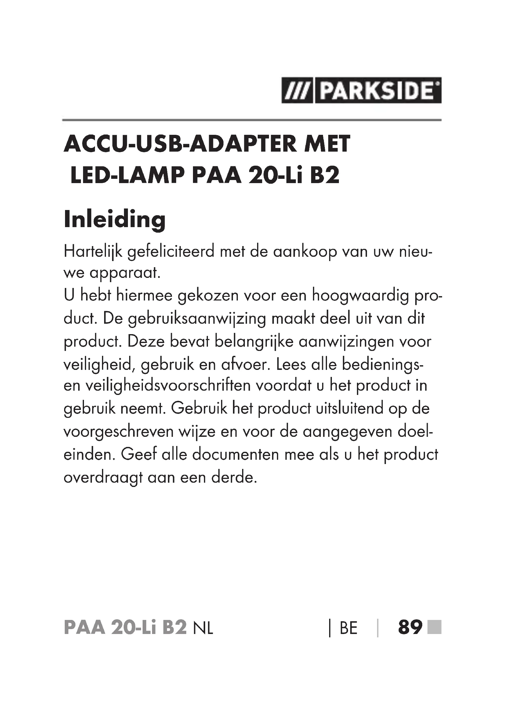 89 ■ ACCU-USB-ADAPTER MET LED-LAMP PAA 20-Li B2 Inleiding Hartelijk gefeliciteerd met de aankoop van uw nieu- we apparaat. U hebt hiermee gekozen voor een hoogwaardig pro- duct. De gebruiksaanwijzing maakt deel uit van dit product. Deze bevat belangrijke aanwijzingen voor veiligheid, gebruik en afvoer. Lees alle bedienings- en veiligheidsvoorschriften voordat u het product in gebruik neemt. Gebruik het product uitsluitend op de voorgeschreven wijze en voor de aangegeven doel- einden. Geef alle documenten mee als u het product overdraagt aan een derde.PAA 20-Li B2■ 90