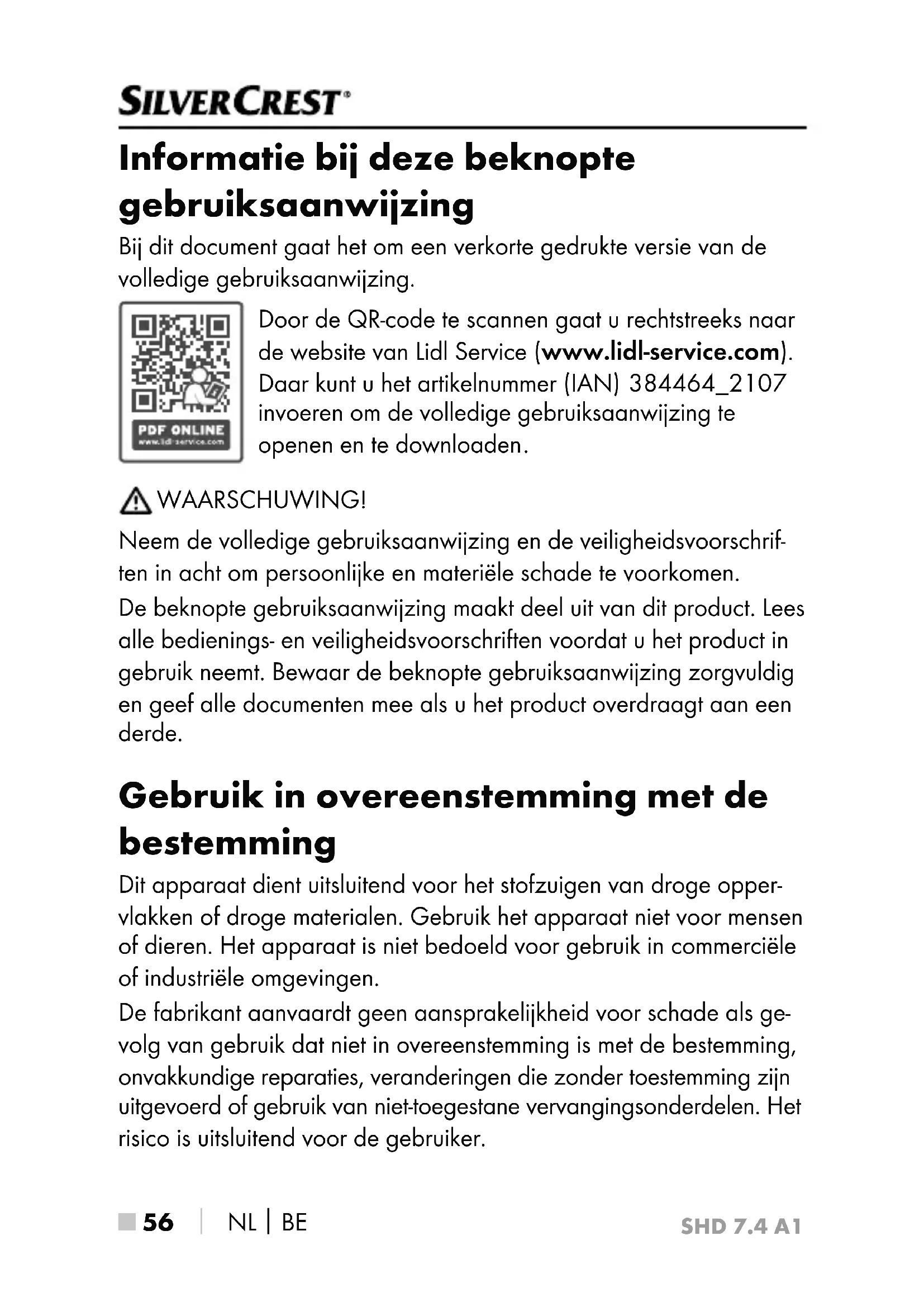 Informatie bij deze beknopte gebruiksaanwijzing Bij dit document gaat het om een verkorte gedrukte versie van de volledige gebruiksaanwijzing. Door de QR-code te scannen gaat u rechtstreeks naar de website van Lidl Service (www.lidl-service.com). Daar kunt u het artikelnummer (IAN) 384464_2107 invoeren om de volledige gebruiksaanwijzing te openen en te downloaden