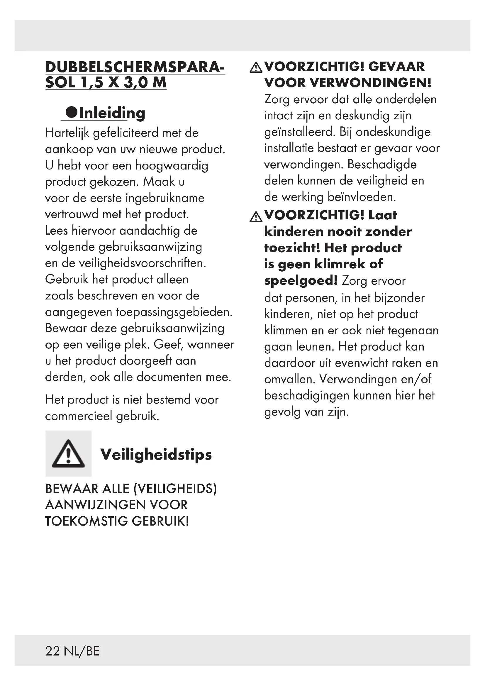 VOORZICHTIG! GEVAAR VOOR OMVALLEN! Zorg er altijd voor dat het product stevig staat. Steek de parasol in een daarvoor geschikt(e) grondanker/parasolstandaard. Doet u dat niet dan kan de parasol omvallen en verwondingen en/of materiële schade veroorzaken.