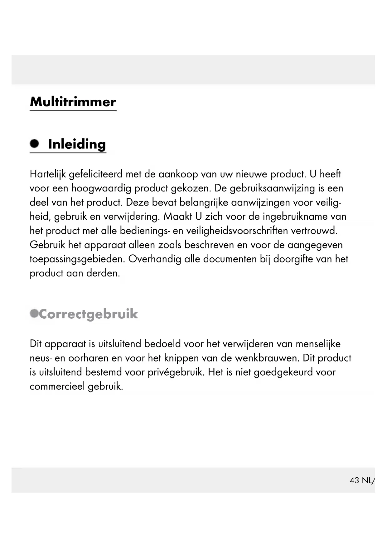 Gebruik de meegele- verde borstel indien er haren tussen de mes- sen zitten. Verwijdering De verpakking bestaat uit milieuvriendelijke grondstoffen die u via de plaatselijke recyclingcontainers kunt afvoeren. Informatie over de mogelijkheden om het uitgediende product te verwijderen, verstrekt uw gemeentelijke overheid.52 NL/BE Gooi het afgedankte product omwille van het milieu niet weg via het huisvuil, maar geef het af bij het daarvoor bestemde depot of het gemeentelijke milieupark. Over afgifteplaatsen en hun openingstijden kunt u zich bij uw aangewezen instantie informeren. Defecte of verbruikte batterijen moeten volgens de richtlijn 2006 / 66 / EG worden gerecycled. Geef batterijen en / of het apparaat af bij de daarvoor bestemde verzamelstations. Milieuschade door het foutief verwijderen van batterijen! Batterijen mogen niet via het huisvuil worden weggegooid. Ze kunnen giftig zwaar metaal bevatten en vallen onder het chemisch afval. De chemische symbolen van de zware metalen zijn als volgt: Cd = cadmium, Hg = kwik, Pb = lood. Geef verbruikte batterijen daarom af bij een gemeentelijk inza- melpunt. Informatie Conformiteitsverklaring Wij, OWIM GmbH & Co. KG, Stiftsbergstraße 1, D-74167 Neckarsulm, verklaren alleen verantwoordelijk te zijn, dat het product Multitrimmer,53 NL/BE modelnr.: HG01088, versie: 08 / 2016, waarvoor deze verklaring geldt, voldoet aan de normen / normatieve documenten van 2006 / 42 / EG, 2014 / 30 / EU, 2011 / 65 / EU. Toegepaste normen: EN 60335-1:2012 / A11:2014 EN 60335-2-8:2003 / A2:2008 EN 62233:2008 EN ISO 12100:2010 EN 50581:2012 EN 55014-1:2006 / A2:2011 EN 55014-2:1997 / A2:2008 Tobias Koenig Afdelingsmanager Neckarsulm, 04 May 2016 De complete conformiteitsverklaring kunt u indien gewenst nalezen via www.owim.com.54 NL/BE Garantie Het apparaat wordt volgens strenge kwaliteitsrichtlijnen zorgvuldig gepro- duceerd en voor levering grondig getest. In geval van schade aan het pro- duct kunt u rechtmatig beroep doen op de verkoper van het product. Deze wettelijke rechten worden door onze hierna vermelde garantie niet beperkt. U ontvangt op dit apparaat 3 jaar garantie vanaf de aankoopdatum. De garantieperiode start op de dag van aankoop. Bewaar de originele kassabon alstublieft. Dit document is nodig als bewijs voor aankoop. Wanneer binnen 3 jaar na de aankoopdatum van dit product een materiaal- of productiefout optreedt, dan wordt het product door ons – naar onze keuze – gratis voor u gerepareerd of vervangen. Deze garantie komt te vervallen als het product beschadigd wordt, niet correct gebruikt of onderhouden wordt. De garantie geldt voor materiaal- en productiefoute n. Deze garantie is niet van toepassing op productonderdelen, die onderhevig zijn aan normale slijtage en hierdoor als aan slijtage onderhevige onderdelen gelden (bijv. batterijen) of voor beschadigingen aan breekbare onderdelen, zoals bijv. schakelaars, accu’s of dergelijke onderdelen, die gemaakt zijn van glas.55 DE/AT/CH Einleitung ....................................................................................Seite 56 Bestimmungsgemäße Verwendung ...............................................Seite 56 Teilebeschreibung .......................................................................... Seite 57 Technische Daten ........................................................................... Seite 57 Lieferumfang ...................................................................................Seite 57 Sicherheitshinweise ...........................................................Seite 58 Sicherheitshinweise für Batterien ...................................................Seite 60 Inbetriebnahme ....................................................................Seite 61 Batterie einsetzen / auswechseln ..................................................Seite 61 Nasen- und Ohrhärchen entfernen ...............................................Seite 62 Augenbrauen schneiden ................................................................Seite 62 Reinigung, Pflege, Aufbewahrung.......................Seite 63 Fehler beheben .....................................................................Seite 64 Entsorgung ................................................................................Seite 65 Information...............................................................................Seite 66 Konformitätserklärung ....................................................................Seite 66 Garantie ...................................................................................... Seite 6756 DE/AT/CH Multitrimmer Einleitung Wir beglückwünschen Sie zum Kauf Ihres neuen Produkts. Sie haben sich damit für ein hochwertiges Produkt entschieden. Die Bedienungsanleitung ist Teil dieses Produkts. Sie enthält wichtige Hinweise für Sicherheit, Ge- brauch und Entsorgung. Machen Sie sich vor der Benutzung des Produkts mit allen Bedien- und Sicherheitshinweisen vertraut. Benutzen Sie das Pro- dukt nur wie beschrieben und für die angegebenen Einsatzbereiche. Hän- digen Sie alle Unterlagen bei Weitergabe des Produkts an Dritte mit aus. Bestimmungsgemäße Verwendung Dieses Gerät ist ausschließlich zum Entfernen von menschlichen Nasen- und Ohrhärchen und zum Schneiden der Augenbrauen vorgesehen. Das Gerät ist ausschließlich für den privaten Gebrauch bestimmt. Es ist nicht für gewerbliche Zwecke zugelassen.57 DE/AT/CH Teilebeschreibung